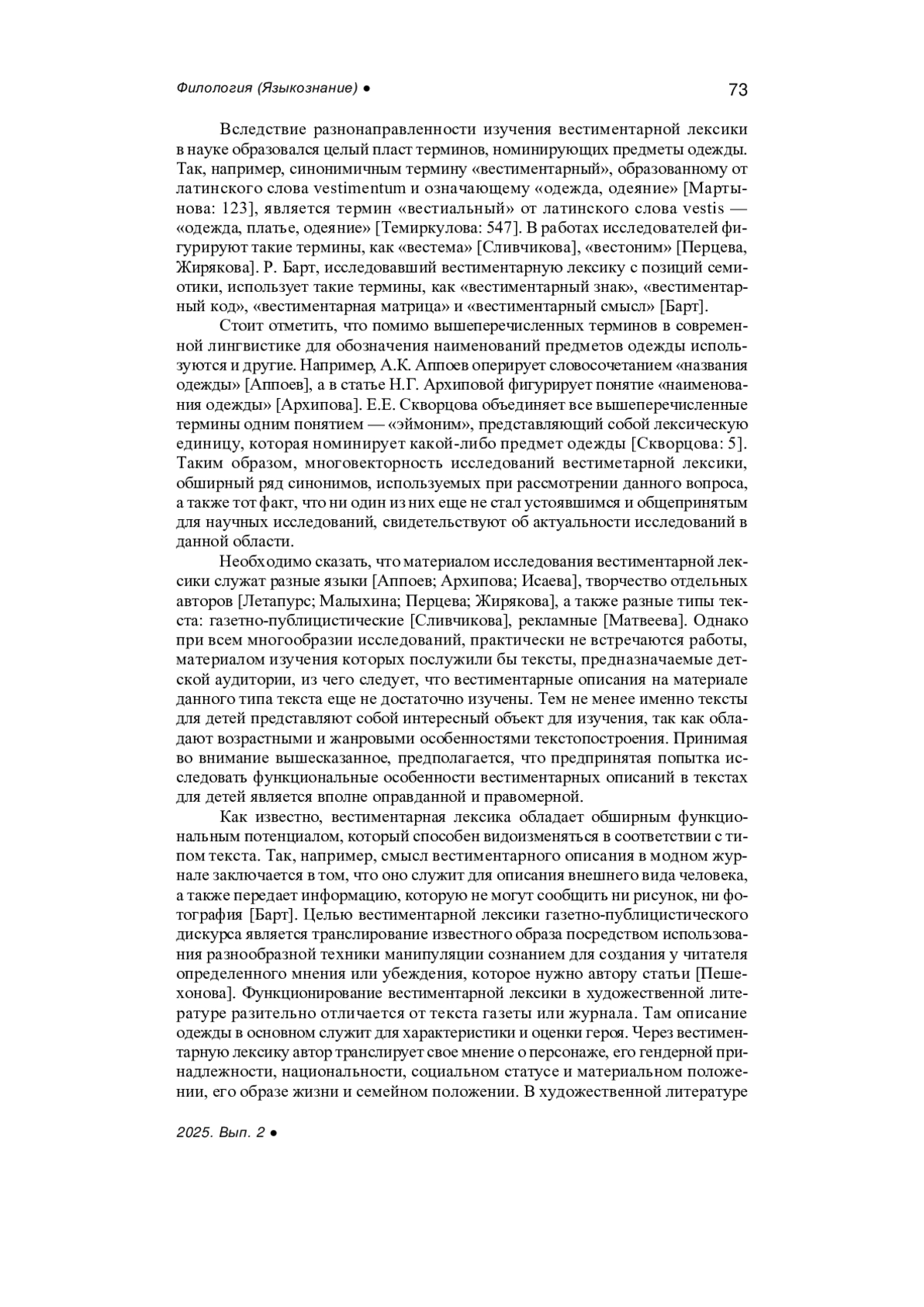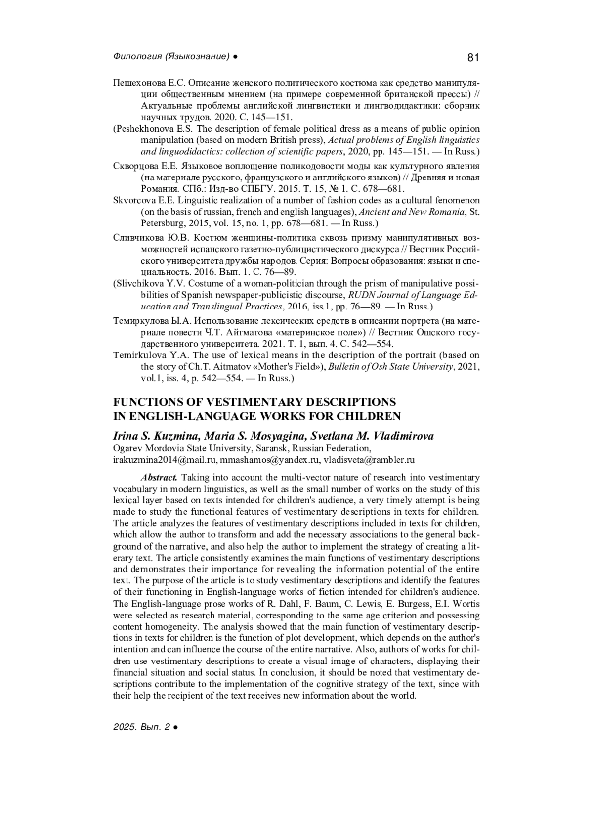 Статья: ФУНКЦИИ ВЕСТИМЕНТАРНЫХ ОПИСАНИЙ В АНГЛОЯЗЫЧНЫХ ПРОИЗВЕДЕНИЯХ ДЛЯ ДЕТЕЙ (2025)