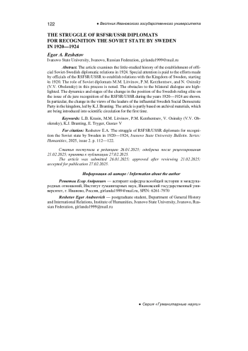 В статье рассматривается малоизученная история установления официальных советско-шведских дипломатических отношений в 1924 году. Особое внимание обращено на усилия, которые предпринимали официальные лица РСФСР/СССР по налаживанию связей с Шведским королевством, начиная с 1920 года. Отмечена роль в этом процессе советских дипломатов М. М. Литвинова, П. М. Керженцева, Н. Осинского (В. В. Оболенского). Выделены препятствия на пути двустороннего диалога. Показана динамика и этапы в изменении позиции правящей элиты Швеции по вопросу о признании РСФСР/СССР де-юре на протяжении 1920—1924 годов. В частности, изменение воззрений лидеров влиятельной в королевстве Шведской социал-демократической партии во главе с К. Я. Брантингом. Статья частично основана на архивных материалах, которые вводятся в научный оборот впервые