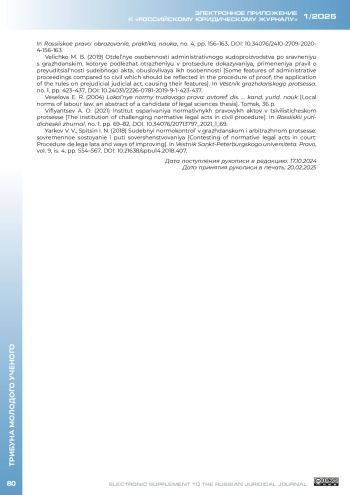 10. Величко М. Б. Отдельные особенности административного судопроизводства по сравнению с гражданским, которые подлежат отражению в процедуре доказывания, применения правил о преюдициальности судебного акта, обусловливая их особенности // Вестник гражданского процесса. 2019. № 1. С. 423-437. DOI: 10.24031/2226-0781-2019-9-1-423-437 EDN: YZYBET