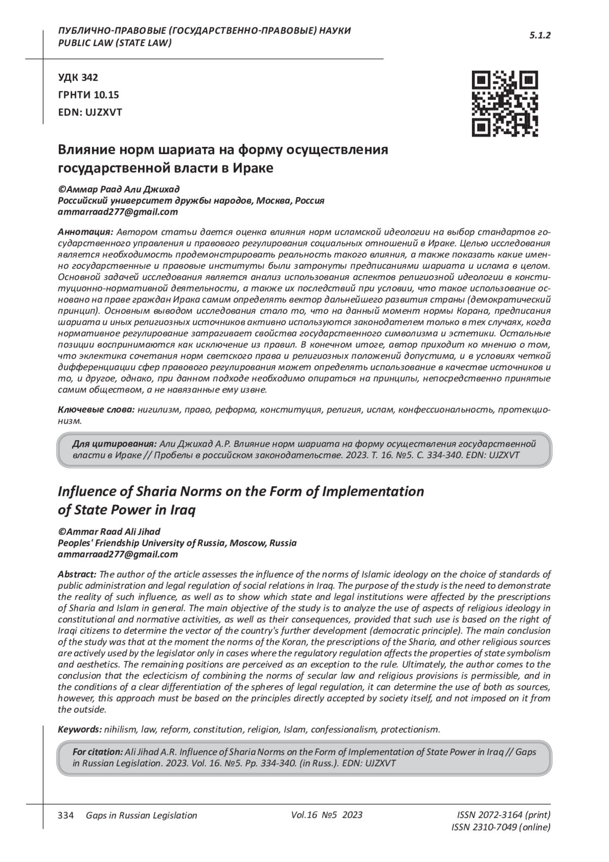 Ali Jihad A. R. Problems of Sharia interaction with the norms of the constitutional law of Iraq: ad deliberandum / A. R. Ali Jihad // Eurasian Law Journal. - 2022. - No. 5 (168). - P. 113-115. EDN: CQBUHY
