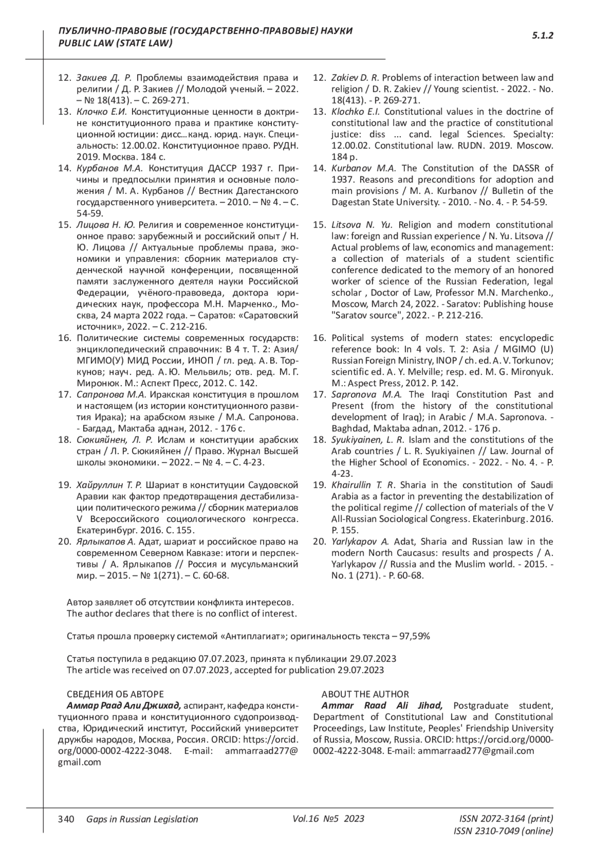 3. Али Джихад А. Р. Проблемы взаимодействия шариата с нормами конституционного права Ирака: ad deliberandum / А. Р. Али Джихад // Евразийский юридический журнал. - 2022. - № 5(168). - С. 113-115. EDN: CQBUHY