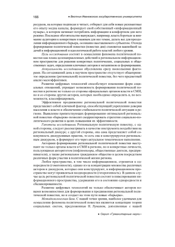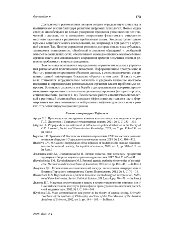 6. Дьякова Е.Г., Трахтенберг А.Д. Социокультурные механизмы установления повестки дня // Научный ежегодник института философии и права уральского отделения российской академии наук. 2001. № 2. С. 166-191. EDN: HYQYGR
