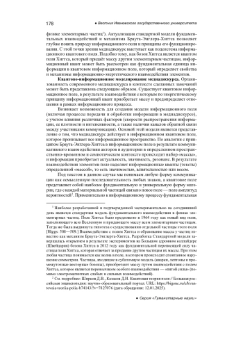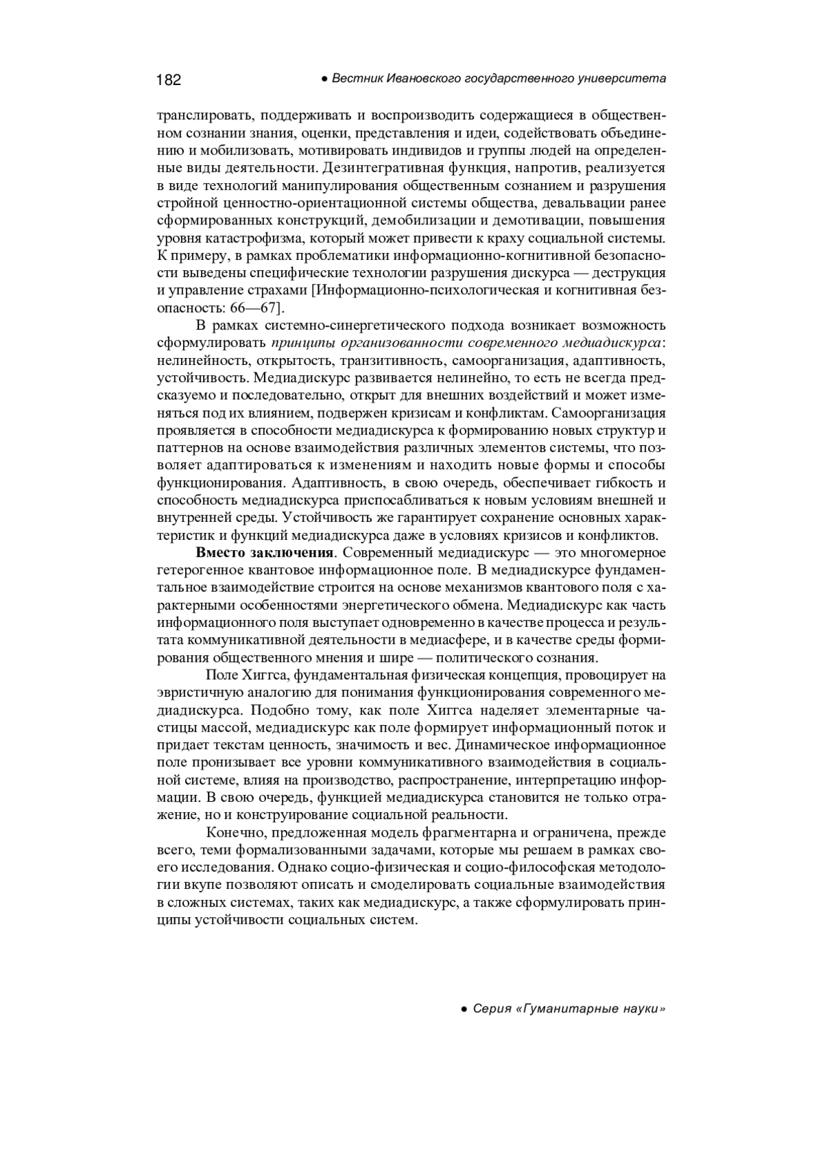 Статья посвящена феномену современного медиадискурса. В качестве методологической базы выступает системно-синергетический подход. Автор рассматривает медиадискурс в контексте представлений об информациосфере (семиосфере). Представлен опыт моделирования информационного поля на основе актуализации стандартной модели фундаментального взаимодействия в физике и квантовой теории поля. Сформулирована системно-синергетическая объяснительная модель динамики медиадискурса. Дано релевантное системное определение современного медиадискурса. Зафиксированы принципы функционирования современного медиадискурса и факторы его организованности — нелинейность, открытость, транзитивность, самоорганизация, адаптивность, устойчивость. Исследование раскрывает возможности расширения методологии социальных наук для анализа механизмов коммуникативного взаимодействия и управления процессами при формировании медиадискурса.
