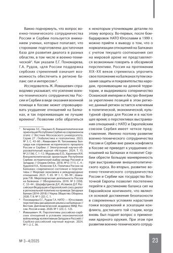Проблема противодействия гонке вооружений и усилению международной напряженности обрела особую актуальность в условиях того, что вновь возник вопрос о применении ядерного оружия в условиях вооруженного конфликта и, соответственно, вопрос о достижении паритета позиций противодействующих сторон для предотвращения использования такого оружия. Установлено, что развитие диалога России и Сербии в военно-технической сфере с учетом геополитического положения Сербии и мощи России сможет обеспечить противодействие усилению позиций НАТО, что послужит основой для достижения баланса сил на Евразийском континенте и предотвращения усиления напряженности. Определена значимость поэтапного налаживания сотрудничества сторон для сохранения взаимного доверия и интереса к постепенному переходу к более тесному диалогу для достижения национальных интересов сторон: России — укрепления системы обеспечения безопасности, Сербии — достижения баланса в проводимом ею внешнеполитическом курсе. В результате проведения исследования автор приходит к выводу о значимости заключения межгосударственного соглашения России и Сербии о развитии военно-технического сотрудничества.