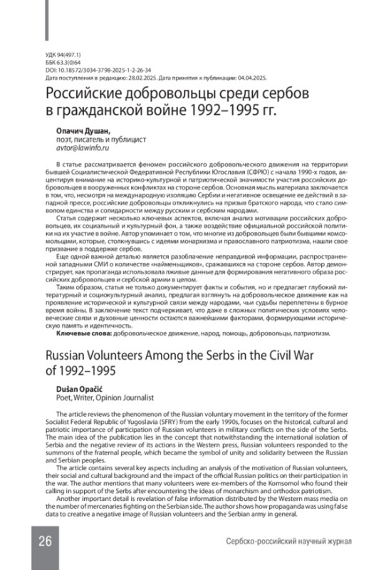 В статье рассматривается феномен российского добровольческого движения на территории бывшей Социалистической Федеративной Республики Югославия (СФРЮ) с начала 1990-х годов, акцентируя внимание на историко-культурной и патриотической значимости участия российских добровольцев в вооруженных конфликтах на стороне сербов. Основная мысль материала заключается в том, что, несмотря на международную изоляцию Сербии и негативное освещение ее действий в западной прессе, российские добровольцы откликнулись на призыв братского народа, что стало символом единства и солидарности между русским и сербским народами.