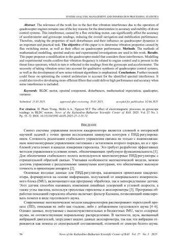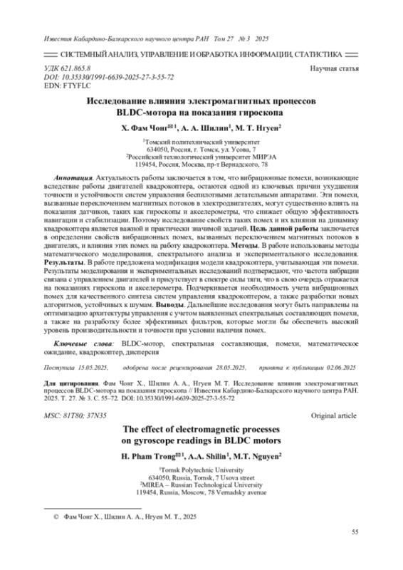 Актуальность работы заключается в том, что вибрационные помехи, возникающие вследствие работы двигателей квадрокоптера, остаются одной из ключевых причин ухудшения точности и устойчивости систем управления беспилотными летательными аппаратами. Эти помехи, вызванные переключением магнитных потоков в электродвигателях, могут существенно влиять на показания датчиков, таких как гироскопы и акселерометры, что снижает общую эффективность навигации и стабилизации. Поэтому исследование свойств таких помех и их влияния на динамику квадрокоптера является важной и практически значимой задачей.