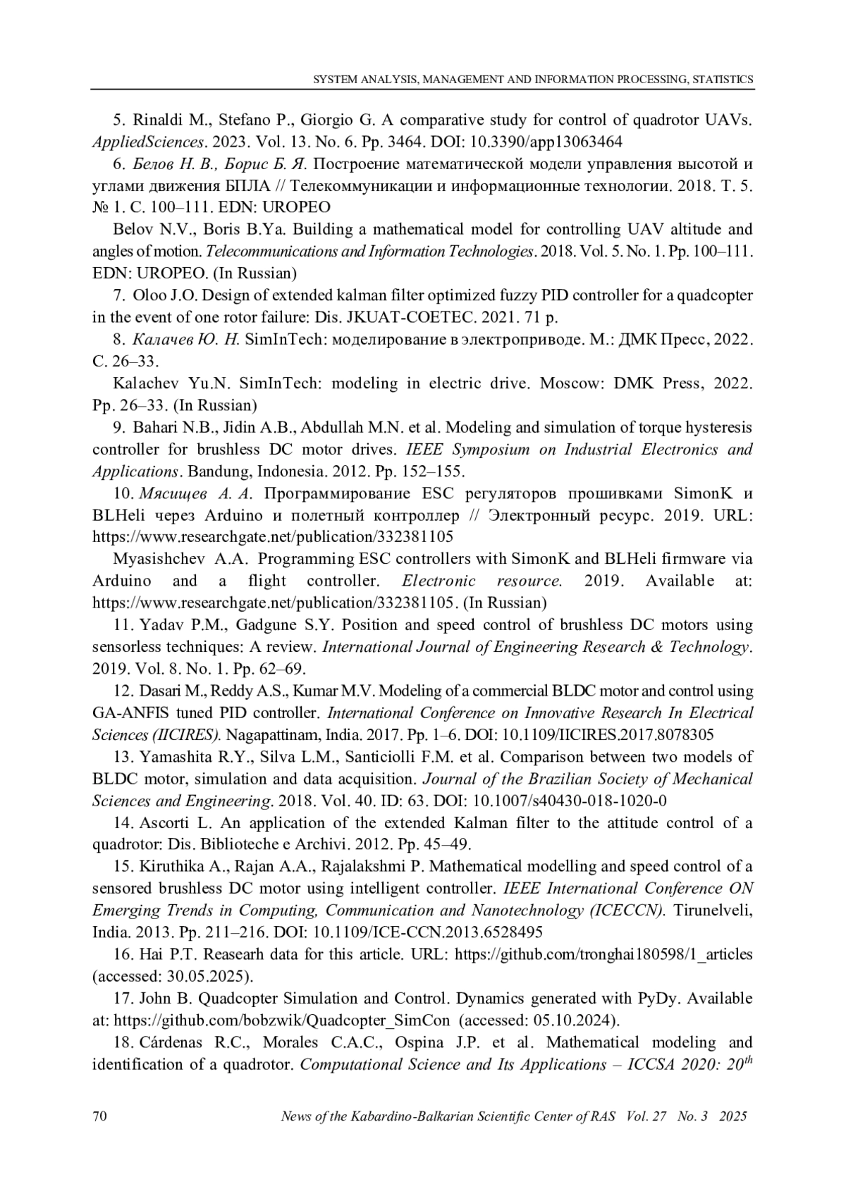 7. Белов H. B., Борис Б. Я. Построение математической модели управления высотой и углами движения БПЛА // Телекоммуникации и информационные технологии. 2018. Т. 5. № 1. С. 100-111. Belov N.V., Boris B.Ya. Building a mathematical model for controlling UAV altitude and angles of motion. Telecommunications and Information Technologies. 2018. Vol. 5. No. 1. Pp. 100-111. (In Russian). EDN: UROPEO
