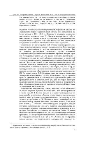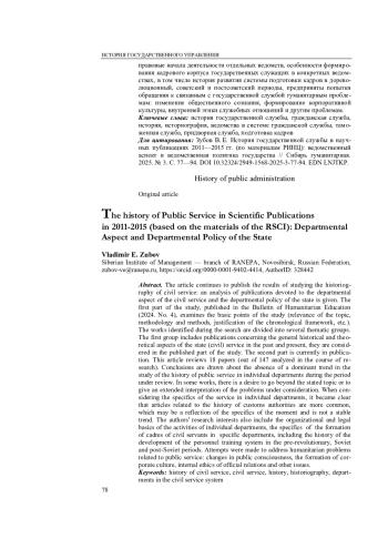1. Зубов В. Е. История государственной службы в научных публикациях 2011— 2015 гг. (по материалам РИНЦ). Ч. I // Вестник гуманитарного образования. 2024. № 4 (36). С. 9—17.