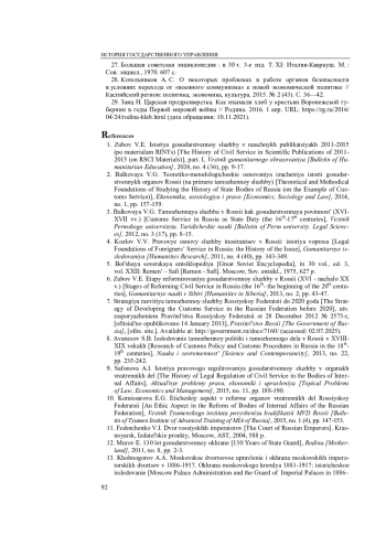 2. Балковая В. Г. Теоретико-методологические основания изучения истории государственных органов России (на примере таможенной службы) // Экономика, социология и право. 2014. № 1. С. 157—159.