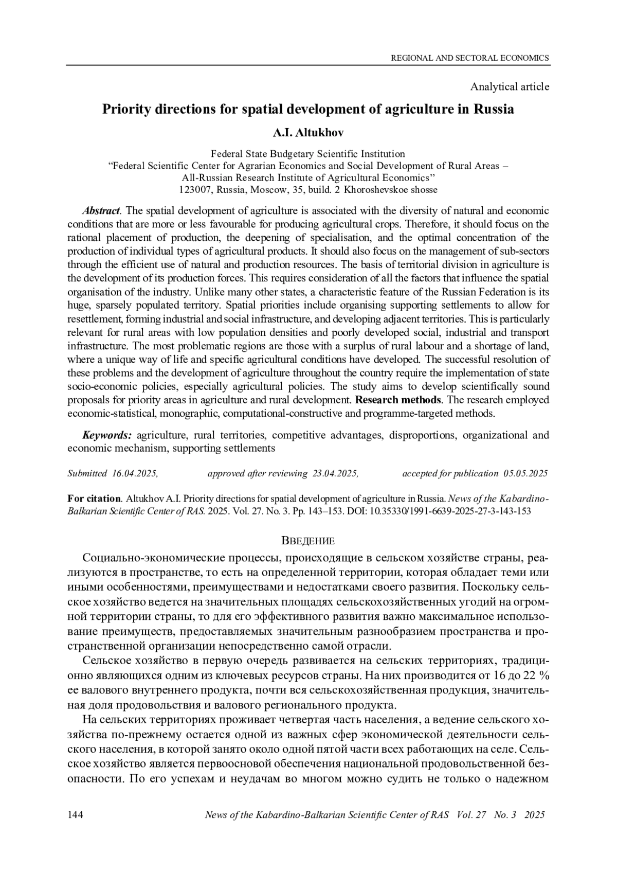 2. Алтухов А. И. Основные направления пространственного развития сельского хозяйства страны // Экономика, труд, управление в сельском хозяйстве. 2020. № 11(68). С. 5-22. DOI: 10.33938/2011-5 EDN: ZDTJWN