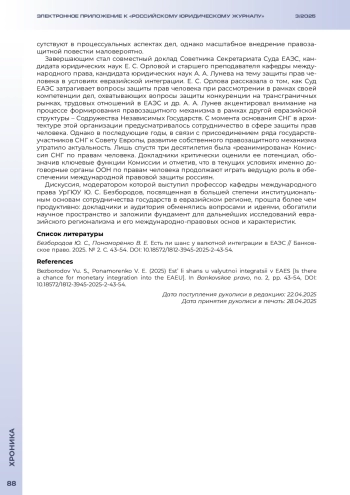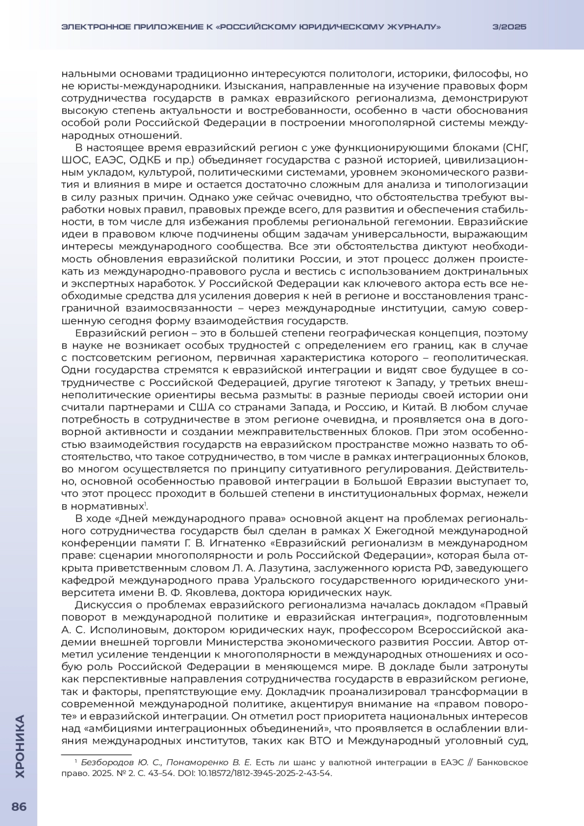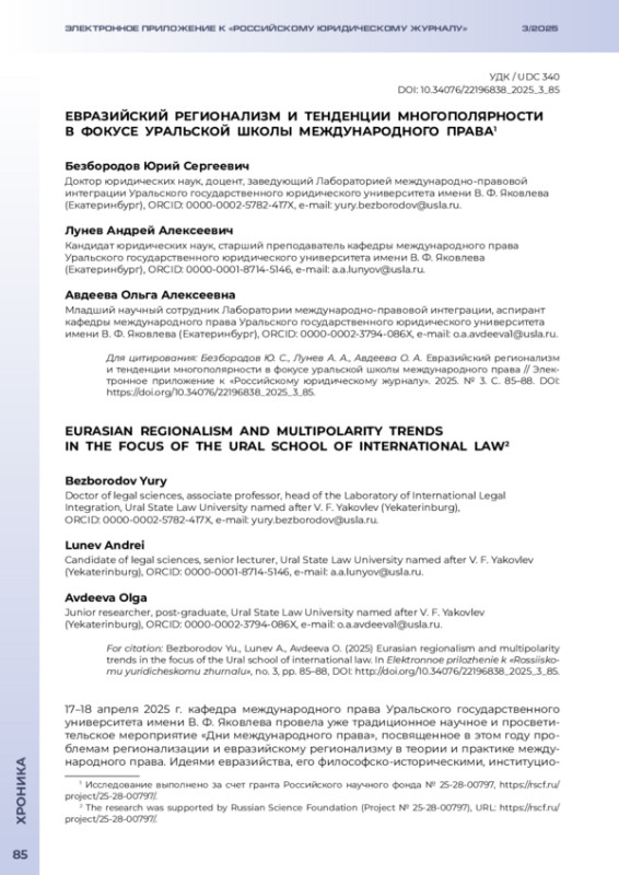 БЕЗБОРОДОВ Ю. С., ЛУНЕВ А. А., АВДЕЕВА О. А. ЕВРАЗИЙСКИЙ РЕГИОНАЛИЗМ И ТЕНДЕНЦИИ МНОГОПОЛЯРНОСТИ В ФОКУСЕ УРАЛЬСКОЙ ШКОЛЫ МЕЖДУНАРОДНОГО ПРАВА // ЭЛЕКТРОННОЕ ПРИЛОЖЕНИЕ К РОССИЙСКОМУ ЮРИДИЧЕСКОМУ ЖУРНАЛУ. 2025. № 3