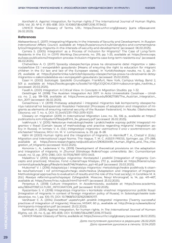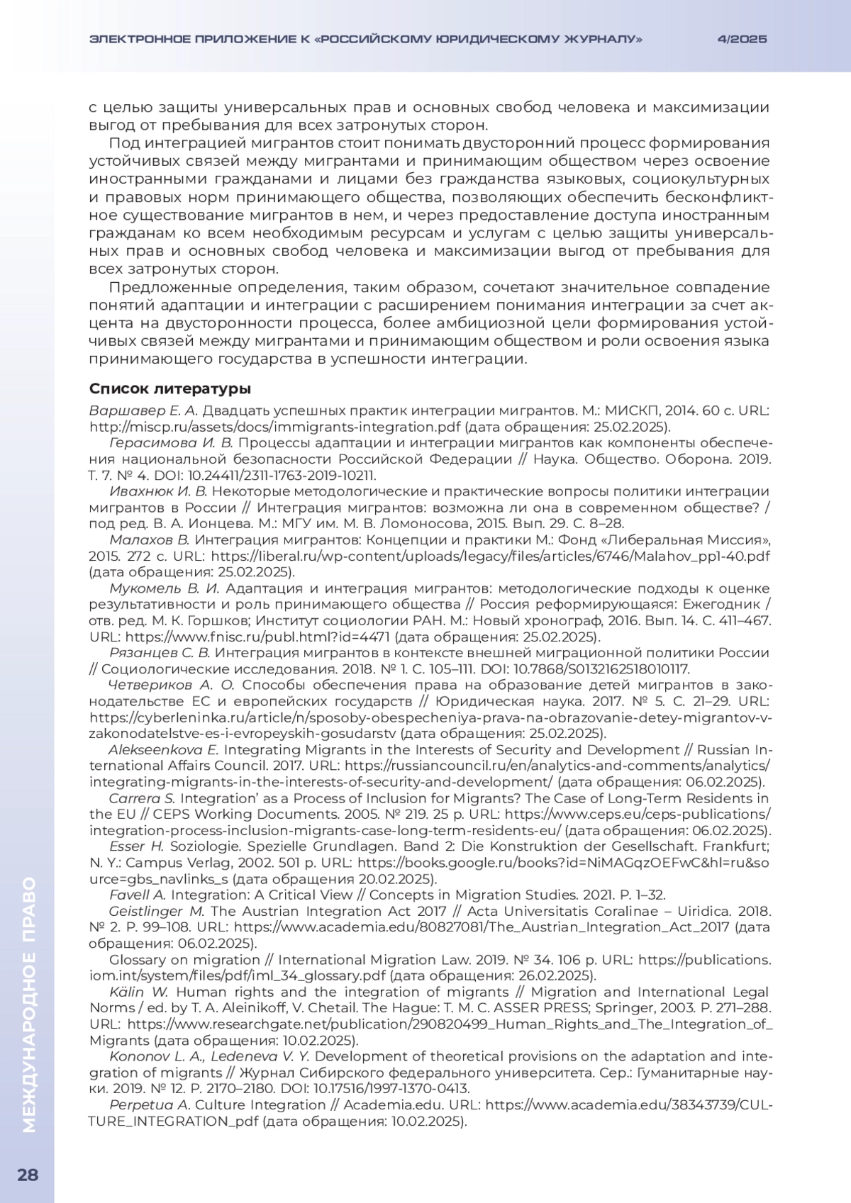 2. Герасимова И. В. Процессы адаптации и интеграции мигрантов как компоненты обеспечения национальной безопасности Российской Федерации // Наука. Общество. Оборона. 2019. Т. 7. № 4. DOI: 10.24411/2311-1763-2019-10211 EDN: UTOVOT