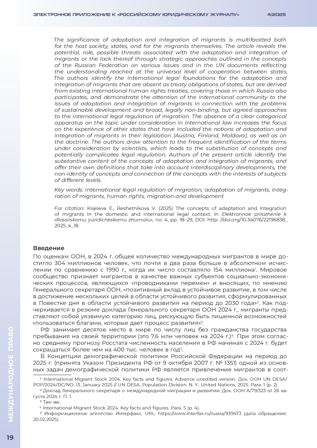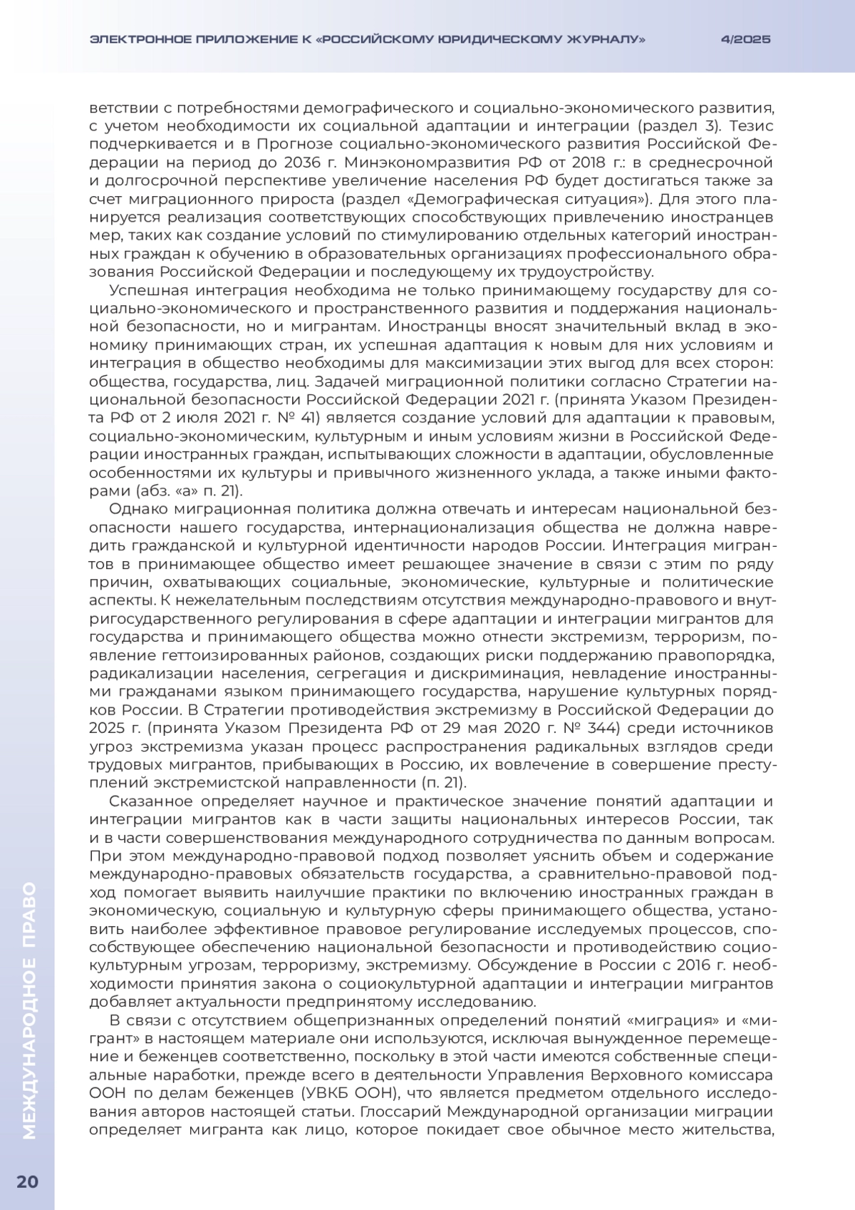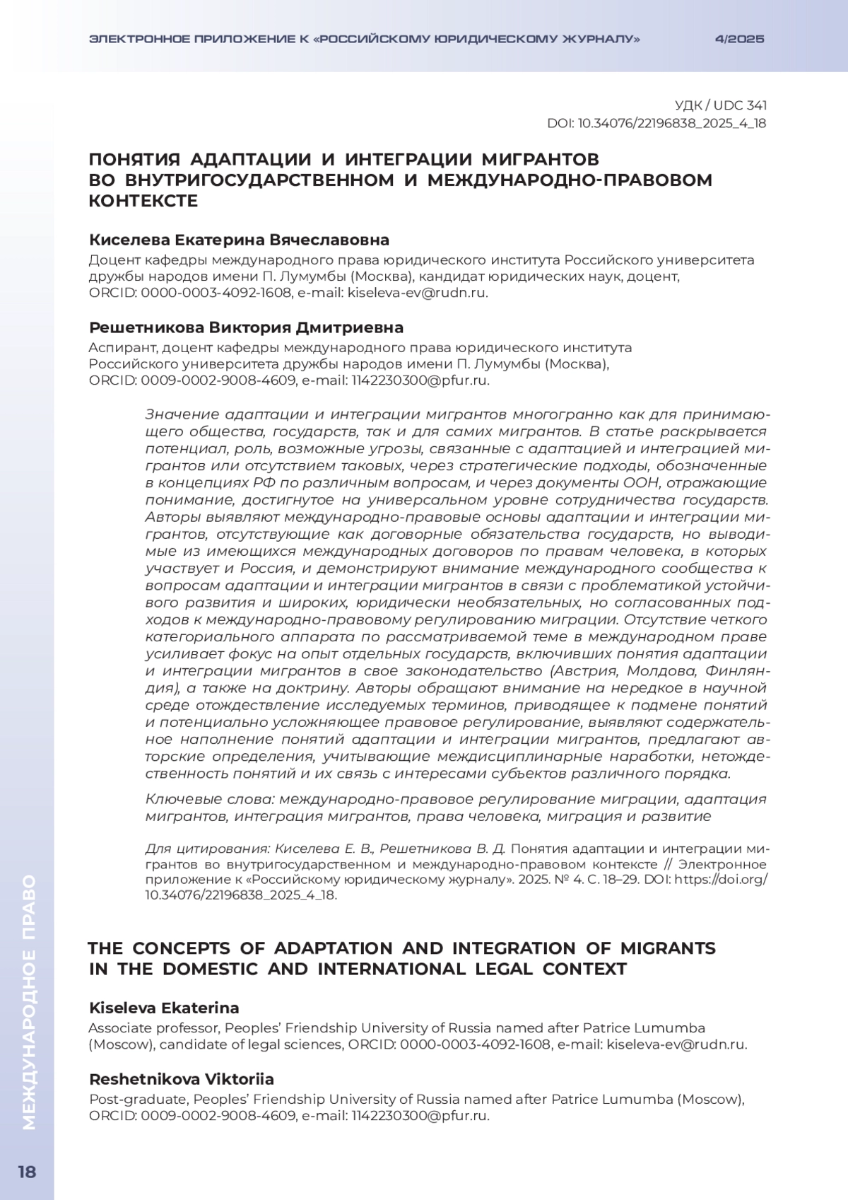 Значение адаптации и интеграции мигрантов многогранно как для принимающего общества, государств, так и для самих мигрантов. В статье раскрывается потенциал, роль, возможные угрозы, связанные с адаптацией и интеграцией мигрантов или отсутствием таковых, через стратегические подходы, обозначенные в концепциях РФ по различным вопросам, и через документы ООН, отражающие понимание, достигнутое на универсальном уровне сотрудничества государств. Авторы выявляют международно-правовые основы адаптации и интеграции мигрантов, отсутствующие как договорные обязательства государств, но выводимые из имеющихся международных договоров по правам человека, в которых участвует и Россия, и демонстрируют внимание международного сообщества к вопросам адаптации и интеграции мигрантов в связи с проблематикой устойчивого развития и широких, юридически необязательных, но согласованных подходов к международно-правовому регулированию миграции. Отсутствие четкого категориального аппарата по рассматриваемой теме в международном праве усиливает фокус на опыт отдельных государств, включивших понятия адаптации и интеграции мигрантов в свое законодательство (Австрия, Молдова, Финляндия), а также на доктрину. Авторы обращают внимание на нередкое в научной среде отождествление исследуемых терминов, приводящее к подмене понятий и потенциально усложняющее правовое регулирование, выявляют содержательное наполнение понятий адаптации и интеграции мигрантов, предлагают авторские определения, учитывающие междисциплинарные наработки, нетождественность понятий и их связь с интересами субъектов различного порядка.