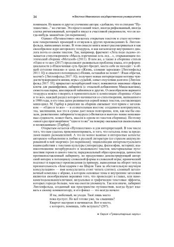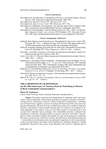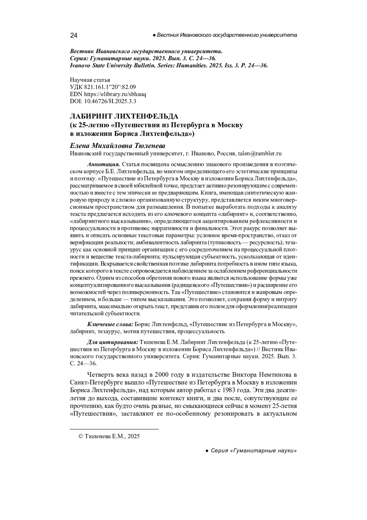 Статья посвящена осмыслению знакового произведения в поэтическом корпусе Б. Е. Лихтенфельда, во многом определяющего его эстетические принципы и поэтику. «Путешествие из Петербурга в Москву в изложении Бориса Лихтенфельда», рассматриваемое в своей юбилейной точке, предстает активно резонирующим с современностью и вместе с тем эпически ее предваряющим. Книга, имеющая синтетическую жанровую природу и сложно организованную структуру, представляется неким многоверсионным пространством для размышления. В попытке выработать подходы к анализу текста предлагается исходить из его ключевого концепта «лабиринт» и, соответственно, «лабиринтного высказывания», определяющегося акцентированием рефлексивности и процессуальности в противовес нарративности и финальности. Этот ракурс позволяет выявить и описать основные текстовые параметры: условное время-пространство, отказ от верификации реальности; амбивалентность лабиринта (тупиковость — ресурсность); тезаурус как основной принцип организации с его сосредоточением на процессуальной плотности и веществе текста-лабиринта; пульсирующая субъектность, ускользающая от идентификации. Вскрывается свойственная поэтике лабиринта потребность в ином типе языка, поиск которого в тексте сопровождается наблюдением за ослаблением референциальности прежнего. Одним из способов обретения нового языка является использование формы уже концептуализированного высказывания (радищевского «Путешествия») и расширение его возможностей через поливерсионность. Так «Путешествие» становится и жанровым определением, и больше — типом высказывания. Это позволяет, сохраняя форму и интригу лабиринта, максимально открыть текст, представив его полем для оформления/реализации читательской субъектности.