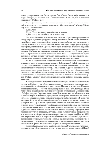 Статья посвящена исследованию тишины в пьесе Т. Уильямса «Орфей спускается в ад», а также в его последующих пьесах, содержащих элементы орфического сюжета. Проведено сравнение семантики молчания у драматургов начала XX века и Уильямса с целью определения возможного влияния. Выявлено несколько функций использования тишины в пьесе, в связи с чем проведено разделение исследуемого предмета на абсолютное молчание и молчание, наполненное музыкой. Определено, что первый вид молчания оказывается связан со смертью и исходит от персонажей, олицетворяющих собой Аида и обитателей царства мертвых, тогда как второй вид связан с внутренней свободой, родством душ, поиском ответов на вопросы об устройстве жизни и исходит от героев, являющихся метафорическими Орфеем и Эвридикой. В качестве образа-символа, сопровождающего молчание, наполненное музыкой, исследован образ птицы. Сделаны выводы о том, что возможность петь как одна из отличительных функций птиц выделяет главных героев среди других персонажей и наделяет их некоторой внутренней силой, позволяющей бороться с жизненными трудностями, в то время как утрата возможности петь или отказ от этой возможности приводит к духовной и физической гибели.