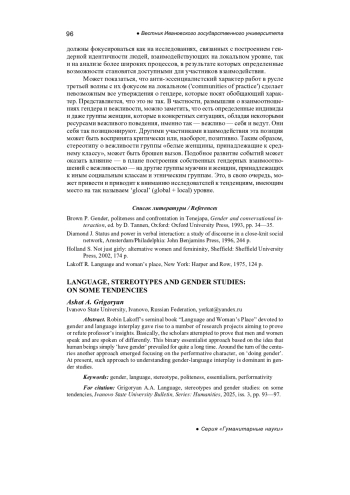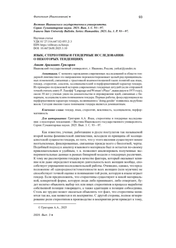 ГРИГОРЯН А. А. ЯЗЫК, СТЕРЕОТИПЫ И ГЕНДЕРНЫЕ ИССЛЕДОВАНИЯ: О НЕКОТОРЫХ ТЕНДЕНЦИЯХ // ВЕСТНИК ИВАНОВСКОГО ГОСУДАРСТВЕННОГО УНИВЕРСИТЕТА. СЕРИЯ: ГУМАНИТАРНЫЕ НАУКИ. 2025. № 3