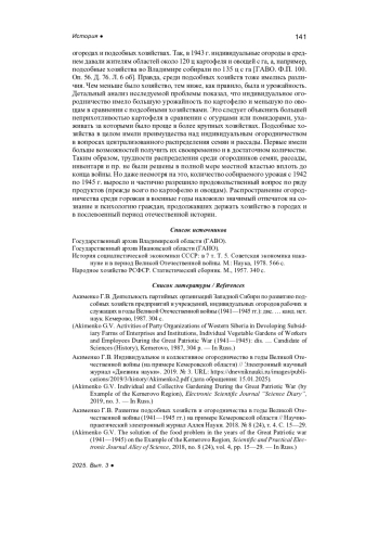 6. Акименко Г.В. Индивидуальное и коллективное огородничество в годы Великой Отечественной войны (на примере Кемеровской области) // Электронный научный журнал “Дневник науки”. 2019. № 3. URL: https://dnevniknauki.ru/images/publications/2019/3/history/Akimenko2.pdf (дата обращения: 15.01.2025).