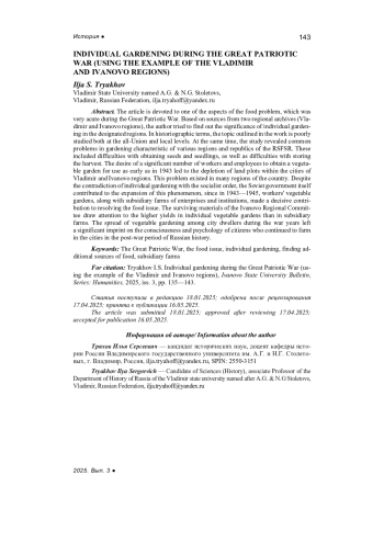 Статья посвящена одному из аспектов продовольственной проблемы, очень остро стоявшей в годы Великой Отечественной войны. На основе источников из двух региональных архивов (Владимирской и Ивановской области) автор попытался выяснить значение индивидуального огородничества в обозначенных регионах. В историографическом плане обозначенная в работе тема является малоизученной как на общесоюзном, так и на местном уровнях. При этом в ходе исследования были выявлены общие проблемы в огородничестве, характерные для самых разных областей и республик РСФСР. К таковым относятся трудности с получением трудящимися семян, рассады, а также сложности с хранением полученного урожая. Стремление значительного количества рабочих и служащих получить в пользование огород уже в 1943 г. привело к исчерпанию земельных фондов внутри городов Владимирской и Ивановской областей, при этом данная проблема имелась во многих регионах страны. Несмотря на противоречие индивидуального огородничества с социалистическими порядками, советская власть сама способствовала расширению этого явления, т. к. в 1943 — 1945 гг. огороды трудящихся наряду с подсобными хозяйствами предприятий и учреждений вносили решающий вклад в разрешение продовольственного вопроса. Сохранившиеся материалы Ивановского обкома обращают внимание на более высокую урожайность в индивидуальных огородах, нежели в подсобных хозяйствах. Распространение огородничества среди горожан в военные годы наложило значимый отпечаток на сознание и психологию граждан, продол жавших держать хозяйство в городах и в послевоенный период отечественной истории.