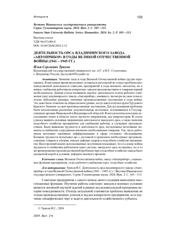 Значение тыла в годы Великой Отечественной войны трудно переоценить. В настоящее время продолжает оставаться актуальной не только проблема производственной деятельности советских предприятий в годы военного лихолетья, но и вопрос снабжения работников конкретных заводов продовольствием и товарами первой необходимости. Данная статья посвящена анализу деятельности отдела рабочего снабжения (орс) владимирского завода «Автоприбор», имевшего, несмотря на свои относительно небольшие размеры, значимые производственные достижения в годы войны. Это даже было отмечено на общесоюзном уровне, когда завод получил орден Трудового Красного Знамени за свои производственные достижения. Для исследования проблемы были использованы различные документальные источники, отложившиеся в Государственных архивах Ивановской и Владимирской областей. В методологическом плане исследование лежит в области такого научного направления, как микроистория. В статье удалось выявить основные направления деятельности заводского орса, а также значение подсобного хозяйства предприятия для снабжения рабочих и служащих продовольствием. Были выявлены трудности в деятельности орса, исследованы негативные моменты в снабжении сотрудников жизненно необходимыми товарами. Так, часть работников негативно оценивали дифференциацию в сфере столового обслуживания. Большие трудности испытывал орс с доставкой и хранением необходимых продовольственных товаров и топлива, имелся дефицит кадров в подсобном хозяйстве предприятия. Всесторонний анализ использованных источников показывает, что и к концу войны трудности в снабжении работников через систему заводского орса оставались, но в то же время решение продовольственной проблемы через подсобное хозяйство завода было адекватной мерой в условиях дефицита военного времени