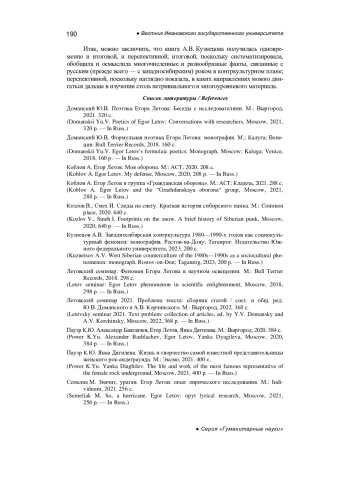1. Доманский Ю.В. Поэтика Егора Летова: Беседы с исследователями. М.: Выргород, 2021. 320 с. EDN: GSFOTM