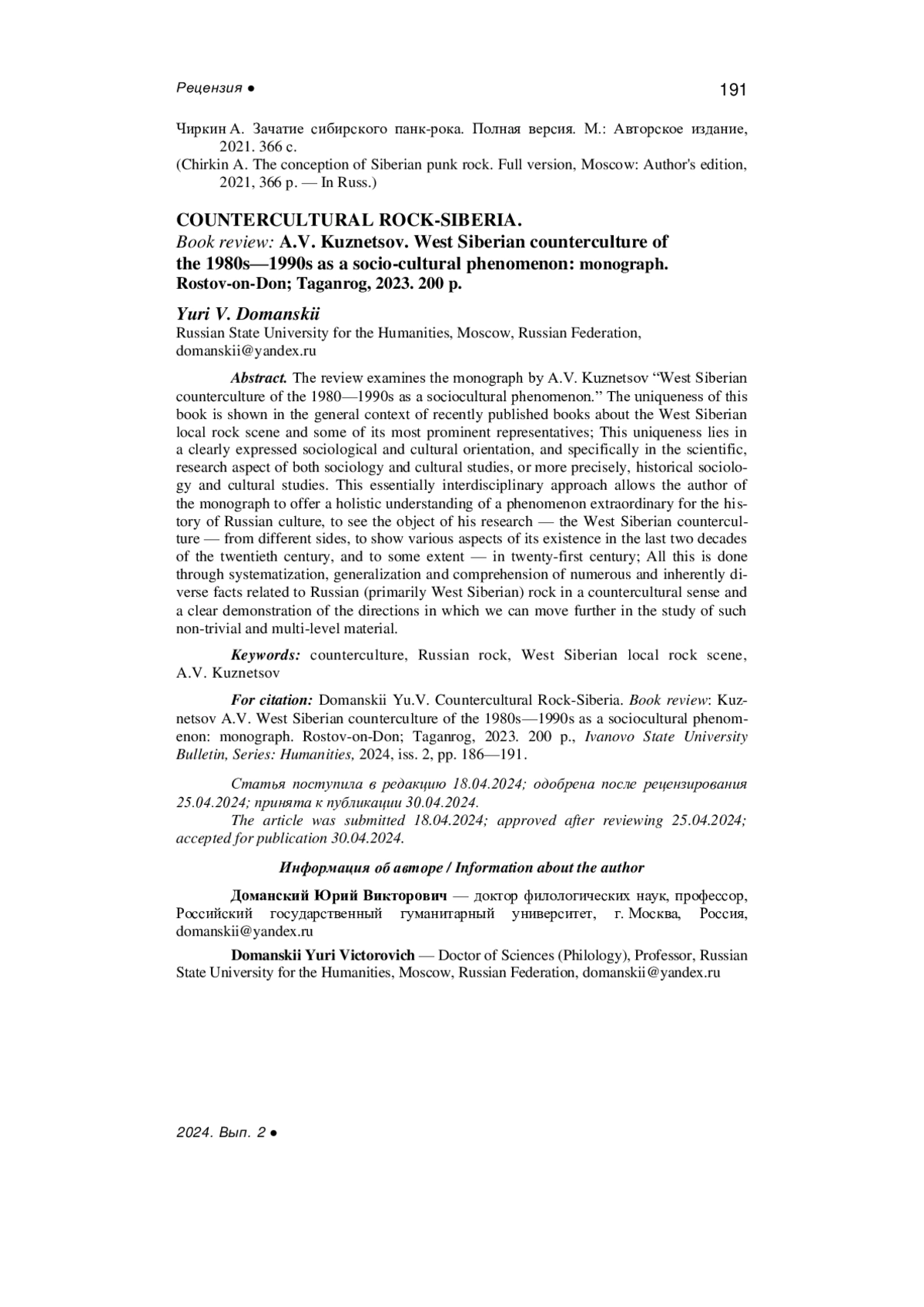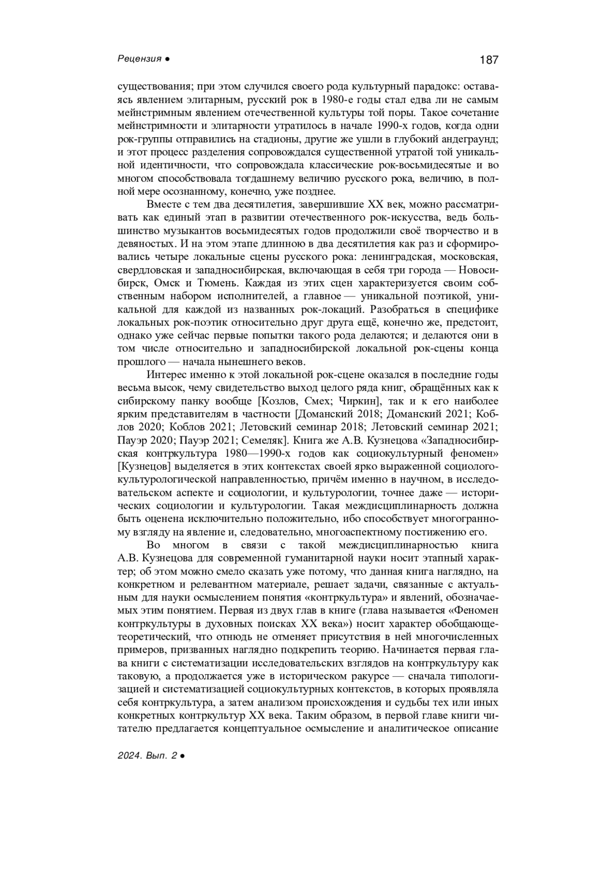 Kuznetsov A.V. West Siberian counterculture of the 1980s-1990s as a sociocultural phenomenon: monograph, Rostov-on-Don, Taganrog, 2023, 200 p. - In Russ.