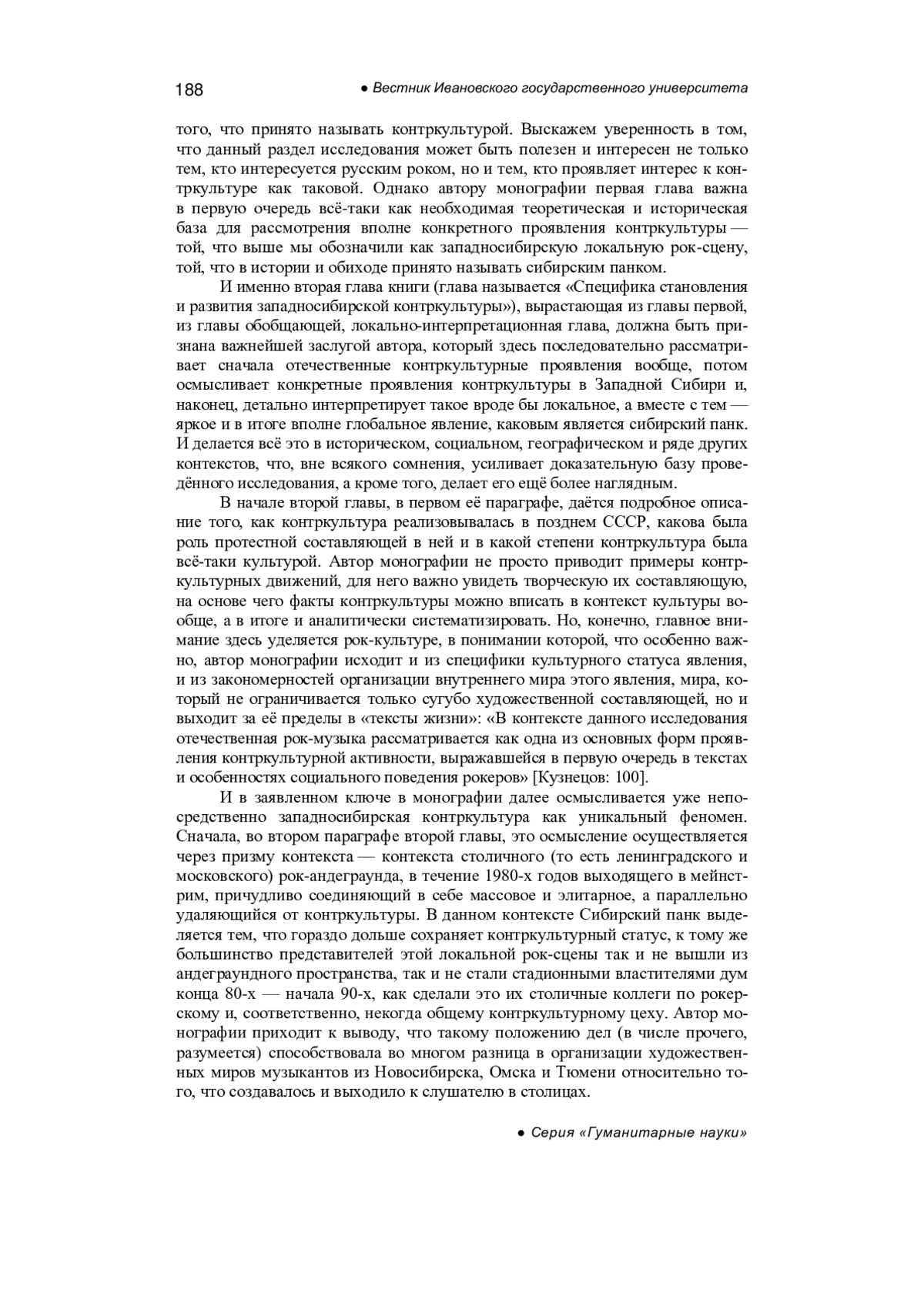 В рецензии рассматривается монография А. В. Кузнецова «Западносибирская контркультура 1980—1990-х годов как социокультурный феномен». Показывается уникальность данной книги в общем контексте вышедших за последнее время книг о западносибирской локальной рок-сцене и отдельных наиболее ярких её представителях; уникальность эта заключается в ярко выраженной социологокультурологической направленности, и именно в научном, в исследовательском аспекте и социологии, и культурологии, точнее даже — исторических социологии и культурологии. Такой междисциплинарный по сути своей подход позволяет автору монографии предложить целостное осмысление неординарного для истории отечественной культуры явления, увидеть объект своего исследования — западносибирскую контркультуру — с разных сторон, показать различные аспекты её существования в последние два десятилетия двадцатого века, а в некоторой степени — и в веке двадцать первом; делается всё это через систематизацию, обобщение и осмысление многочисленных и разнообразных по сути своей фактов, связанных с русским (прежде всего — с западносибирским) роком в контркультурном плане, и через наглядный показ того, в каких направлениях можно двигаться дальше в изучении столь нетривиального и многоуровневого материала.