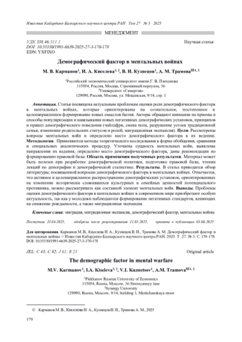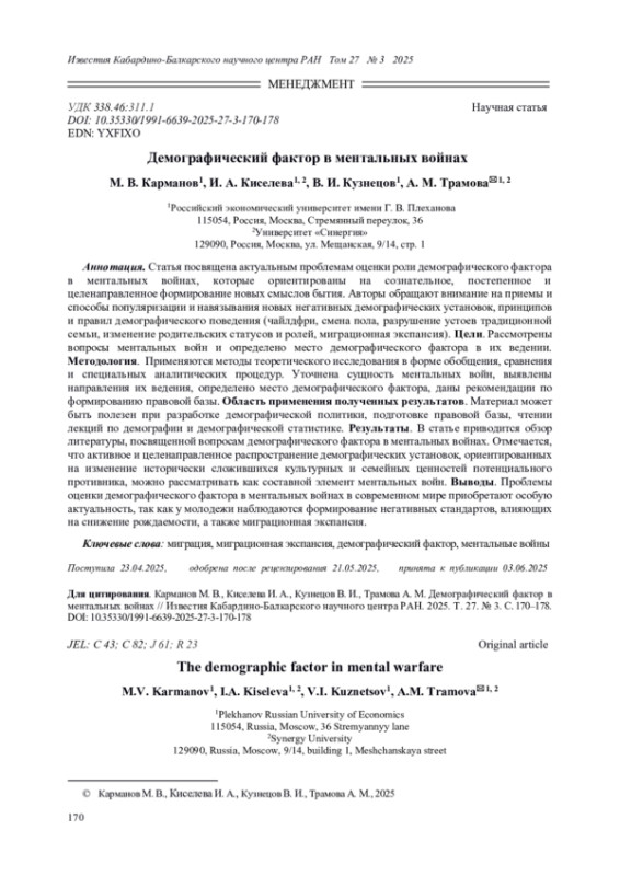 Статья посвящена актуальным проблемам оценки роли демографического фактора в ментальных войнах, которые ориентированы на сознательное, постепенное и целенаправленное формирование новых смыслов бытия. Авторы обращают внимание на приемы и способы популяризации и навязывания новых негативных демографических установок, принципов и правил демографического поведения (чайлдфри, смена пола, разрушение устоев традиционной семьи, изменение родительских статусов и ролей, миграционная экспансия).