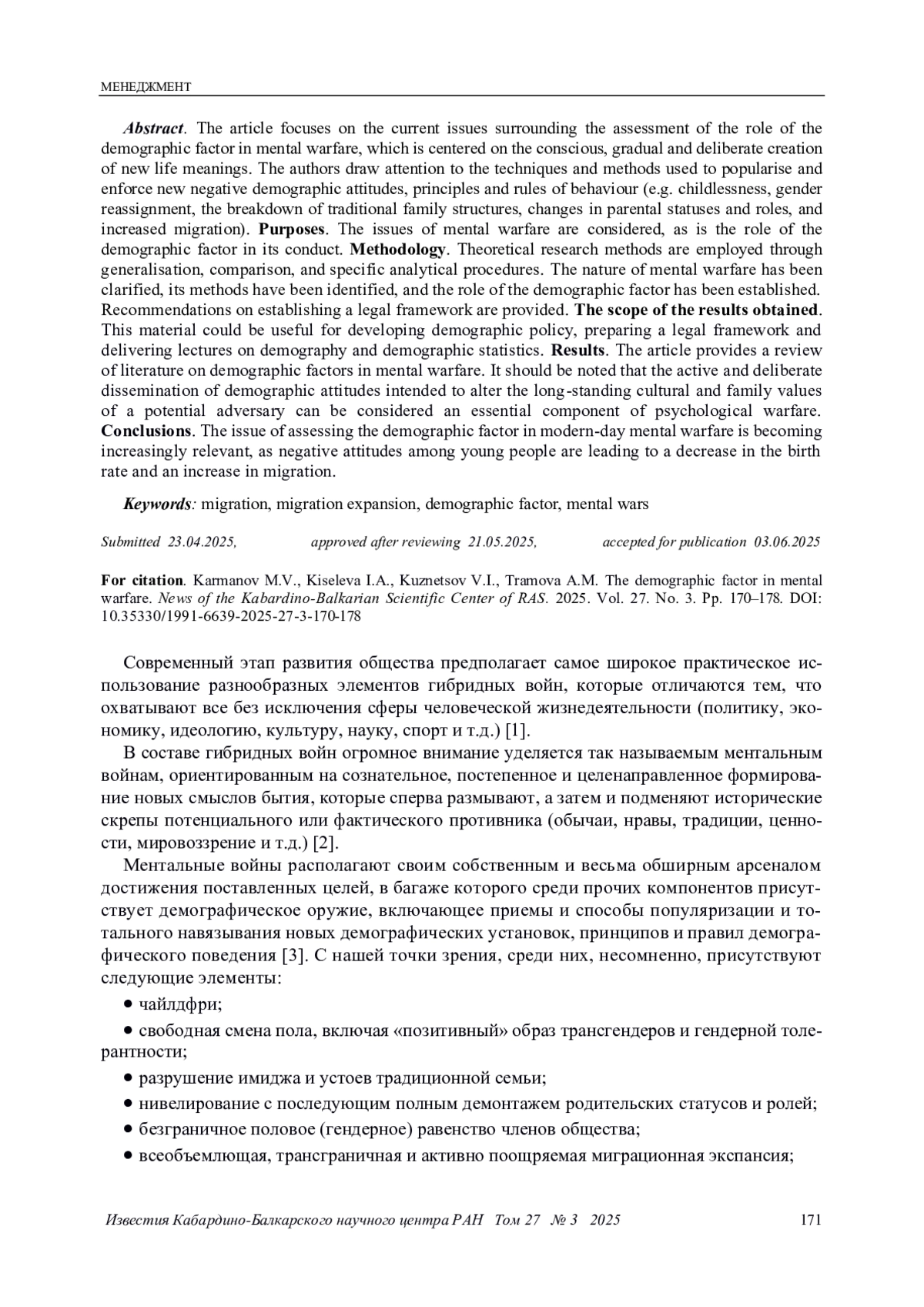 The article focuses on the current issues surrounding the assessment of the role of the demographic factor in mental warfare, which is centered on the conscious, gradual and deliberate creation of new life meanings. The authors draw attention to the techniques and methods used to popularise and enforce new negative demographic attitudes, principles and rules of behaviour (e. g. childlessness, gender reassignment, the breakdown of traditional family structures, changes in parental statuses and roles, and increased migration).