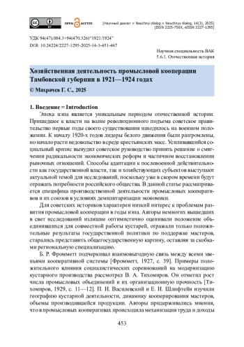 9. Махрачев Г. С. Промысловая кооперация на территории Тамбовской губернии в 1920-х годах / Г. С. Махрачев // Научный диалог. - 2024. - Т. 13. - № 7. - С. 427-444. - https://doi.org/10.24224/2227-1295-2024-13-7-427-444.
