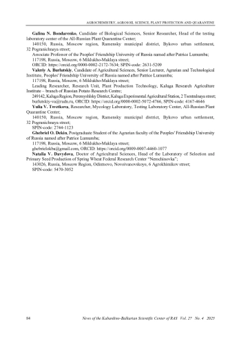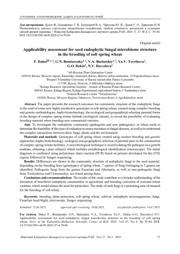 ДУКСИ Ф., БОНДАРЕНКО Г. Н., БУРЛУЦКИЙ В. А., ЦВЕТКОВА Ю. В., ДЕКИН Г. О., ДАВЫДОВА Н. В. ПРИМЕНИМОСТЬ ОЦЕНКИ СТРУКТУРЫ МИКРОБИОМА ЭНДОФИТНЫХ ГРИБОВ СЕМЕННОГО МАТЕРИАЛА В СЕЛЕКЦИИ МЯГКОЙ ЯРОВОЙ ПШЕНИЦЫ // ИЗВЕСТИЯ КАБАРДИНО-БАЛКАРСКОГО НАУЧНОГО ЦЕНТРА РАН. 2025. ТОМ 27 № 4