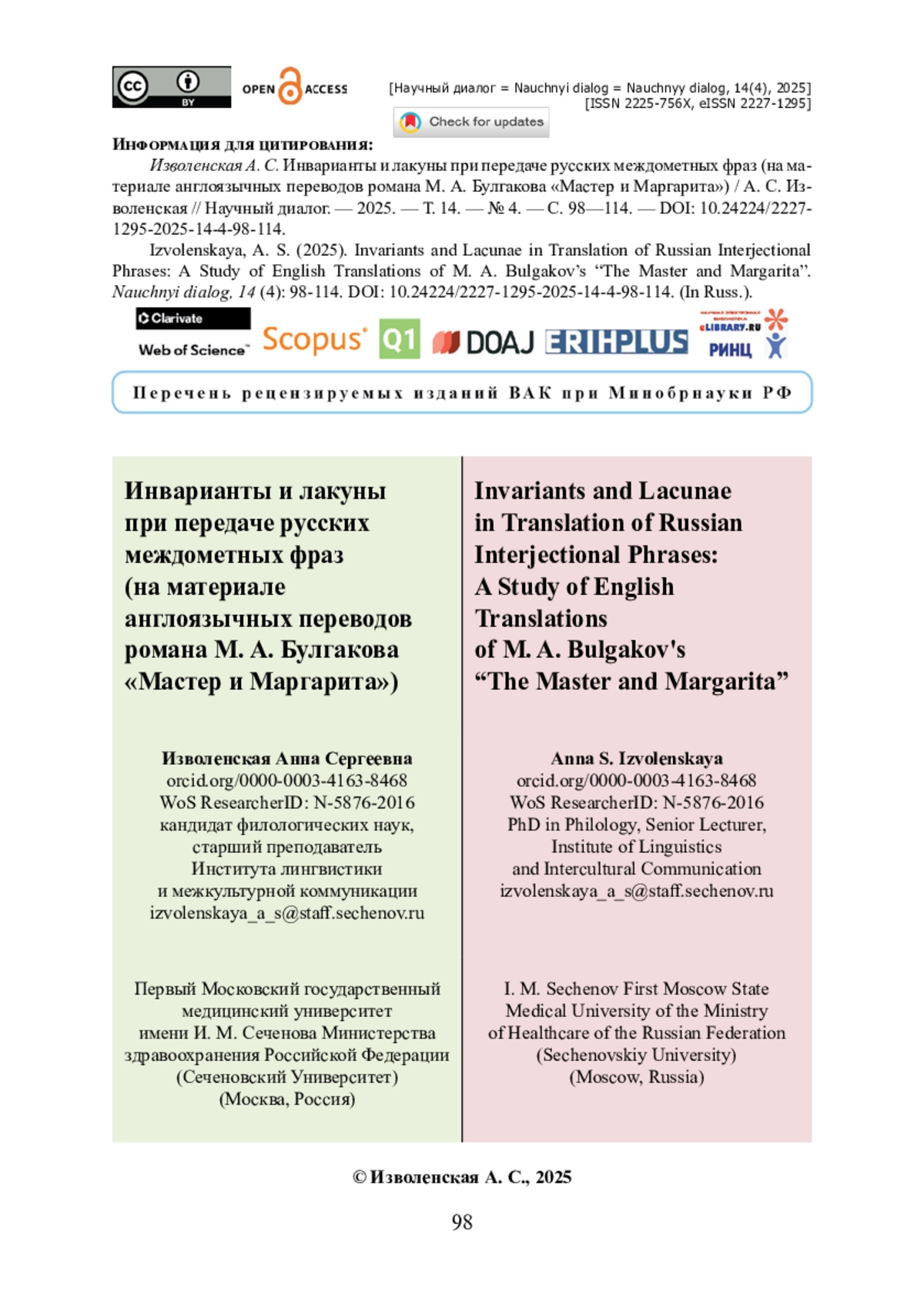 Статья посвящена особенностям выявления и преодоления лингвокультурных лакун в переводном художественном тексте на стилистическом материале романа М. А. Булгакова «Мастер и Маргарита». Применив индуктивным образом метод лингвокогнитивного анализа, мы идентифицировали некоторые имплицитные лакуны. Главные выводы заключаются в следующем: 1) инварианты, выявляемые в процессе анализа переводного художественного текста, служат средством преодоления «мощных» лингвистических и культурологических лакун; 2) анализ некоторых переводческих решений может представлять собой материал для исследования природы лакун и их бытования в художественном тексте в синхроническом и диахроническом аспектах. Сформулирована структура академического переводческого комментария, призванного интегрировать художественный нарратив в исторический контекст для преодоления «мощных» лакун. Комментарий рассматривается как неотъемлемая часть перевода и творческого переводческого процесса. В данной работе мы обращаемся к следующим переводам «Мастера и Маргариты»: Майкла Гленни (1967), Мирры Гинзбург (1967), Дианы Л. Берджин и Кэтрин Т. О’Коннор (1993), Ричарда Пивиера и Ларисы Волохонской (1997) и Хью Эплина (2008).