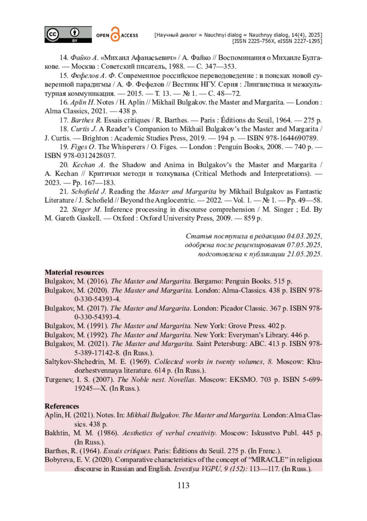 21. Schofield J. Reading the Master and Margarita by Mikhail Bulgakov as Fantastic Literature / J. Schofield // Beyond the Anglocentric. - 2022. - Vol. 1. - № 1. - Pp. 49-58.
