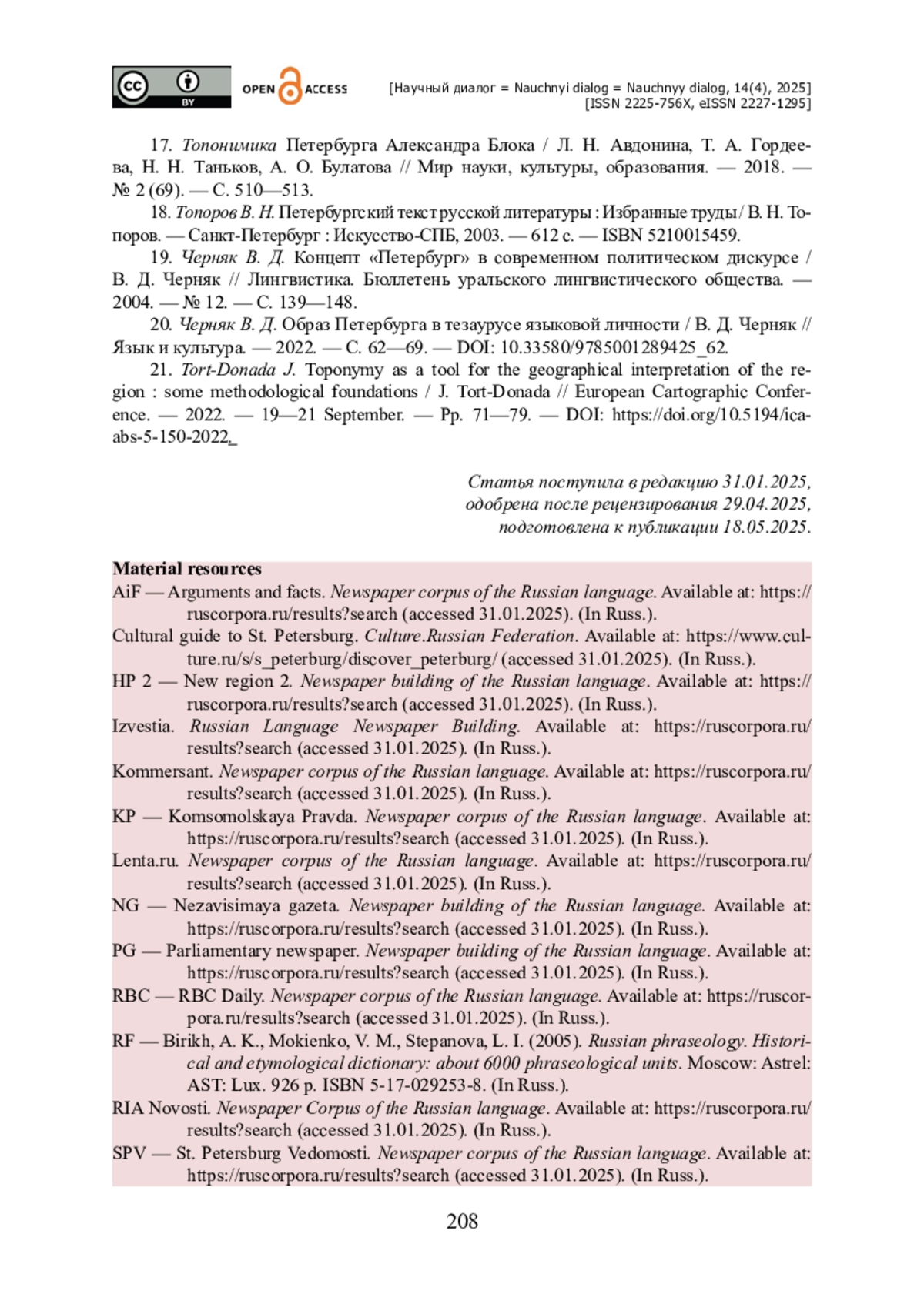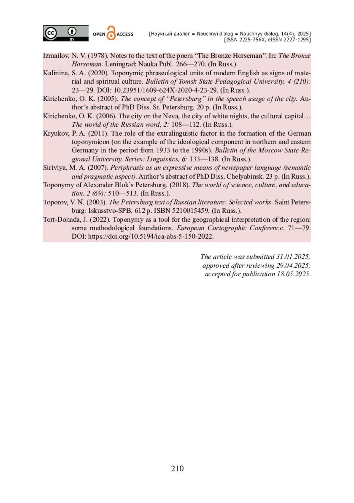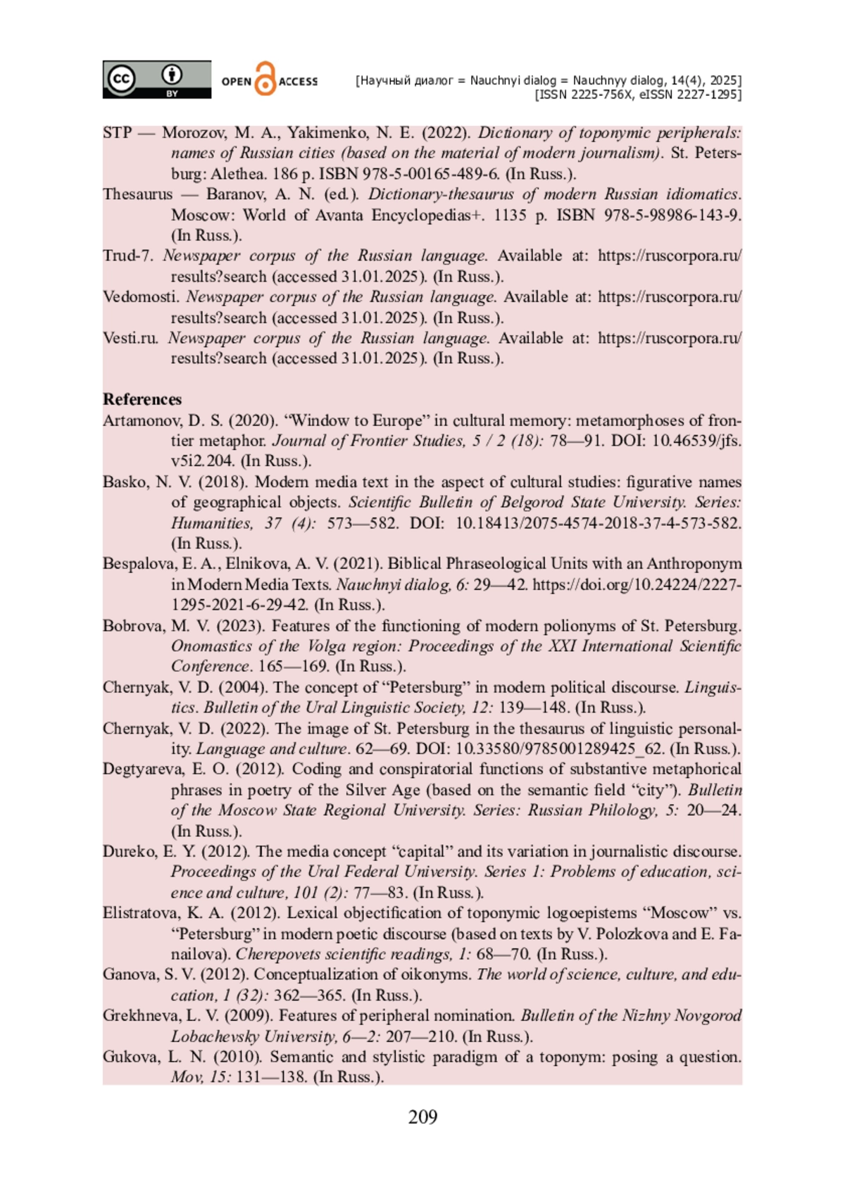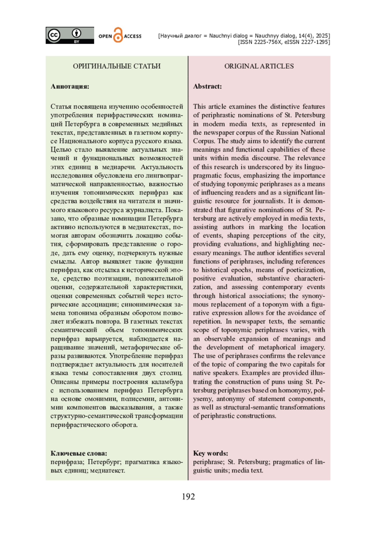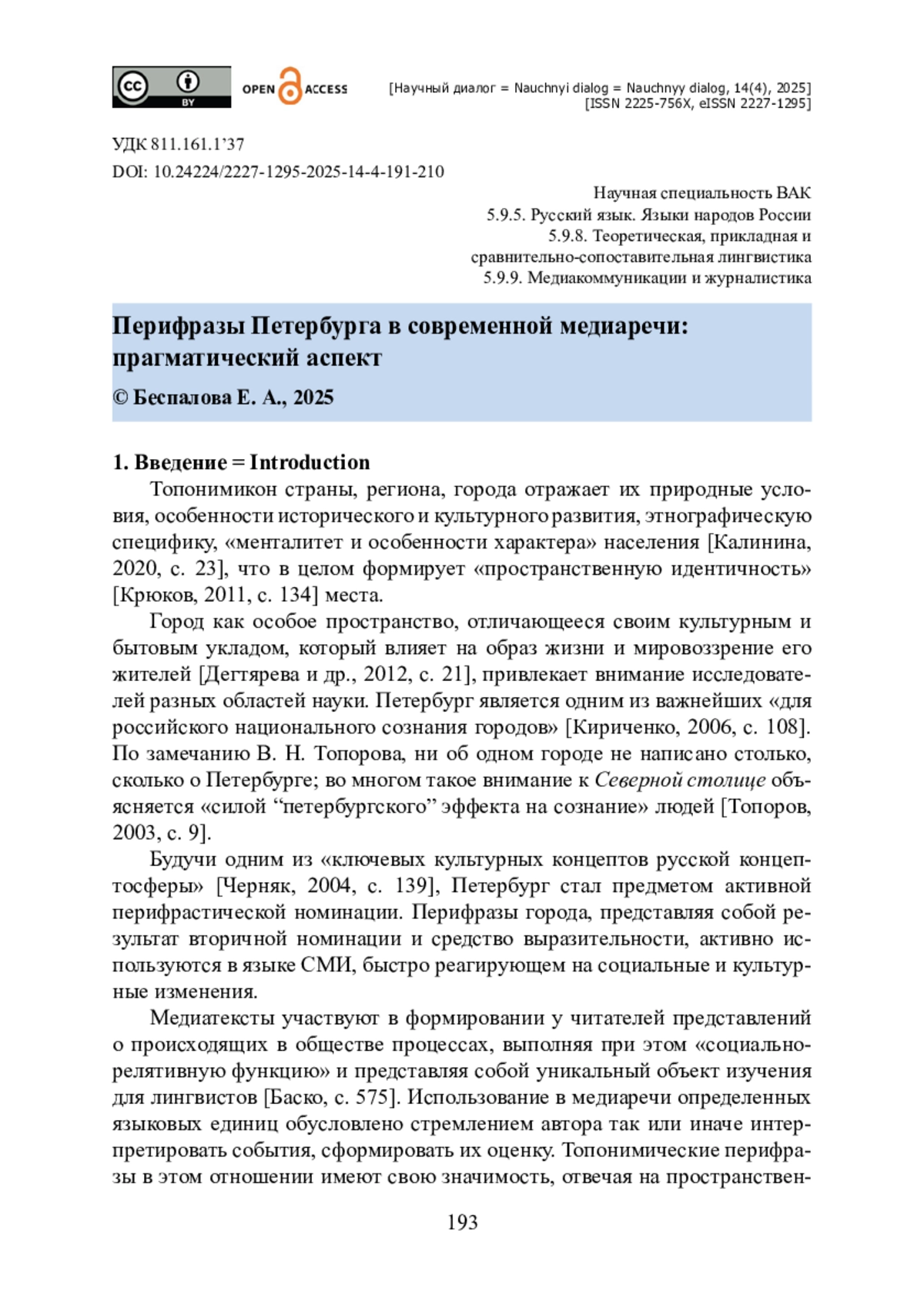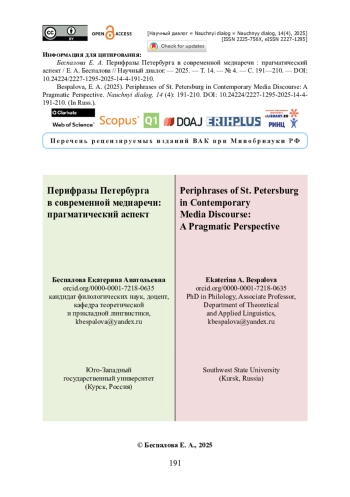 БЕСПАЛОВА Е. А. ПЕРИФРАЗЫ ПЕТЕРБУРГА В СОВРЕМЕННОЙ МЕДИАРЕЧИ: ПРАГМАТИЧЕСКИЙ АСПЕКТ // НАУЧНЫЙ ДИАЛОГ. 2025. ТОМ 14, № 4
