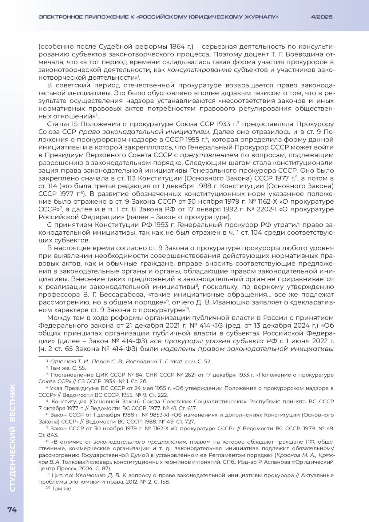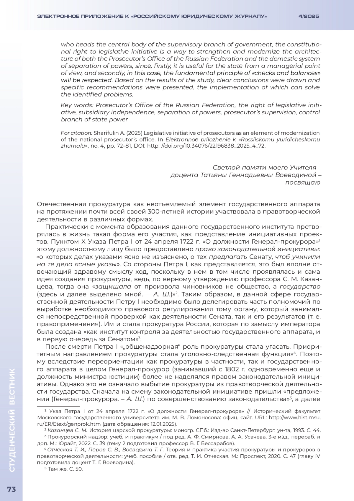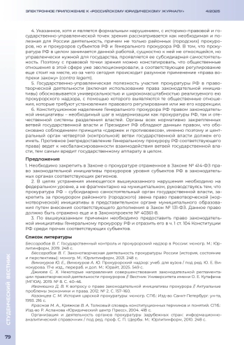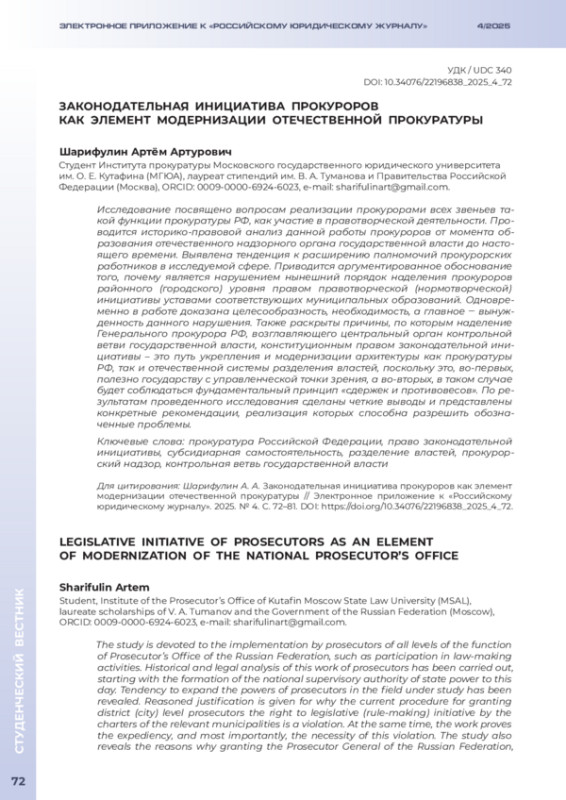 ШАРИФУЛИН А. А. ЗАКОНОДАТЕЛЬНАЯ ИНИЦИАТИВА ПРОКУРОРОВ КАК ЭЛЕМЕНТ МОДЕРНИЗАЦИИ ОТЕЧЕСТВЕННОЙ ПРОКУРАТУРЫ // ЭЛЕКТРОННОЕ ПРИЛОЖЕНИЕ К РОССИЙСКОМУ ЮРИДИЧЕСКОМУ ЖУРНАЛУ. 2025. № 4