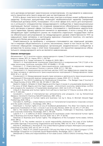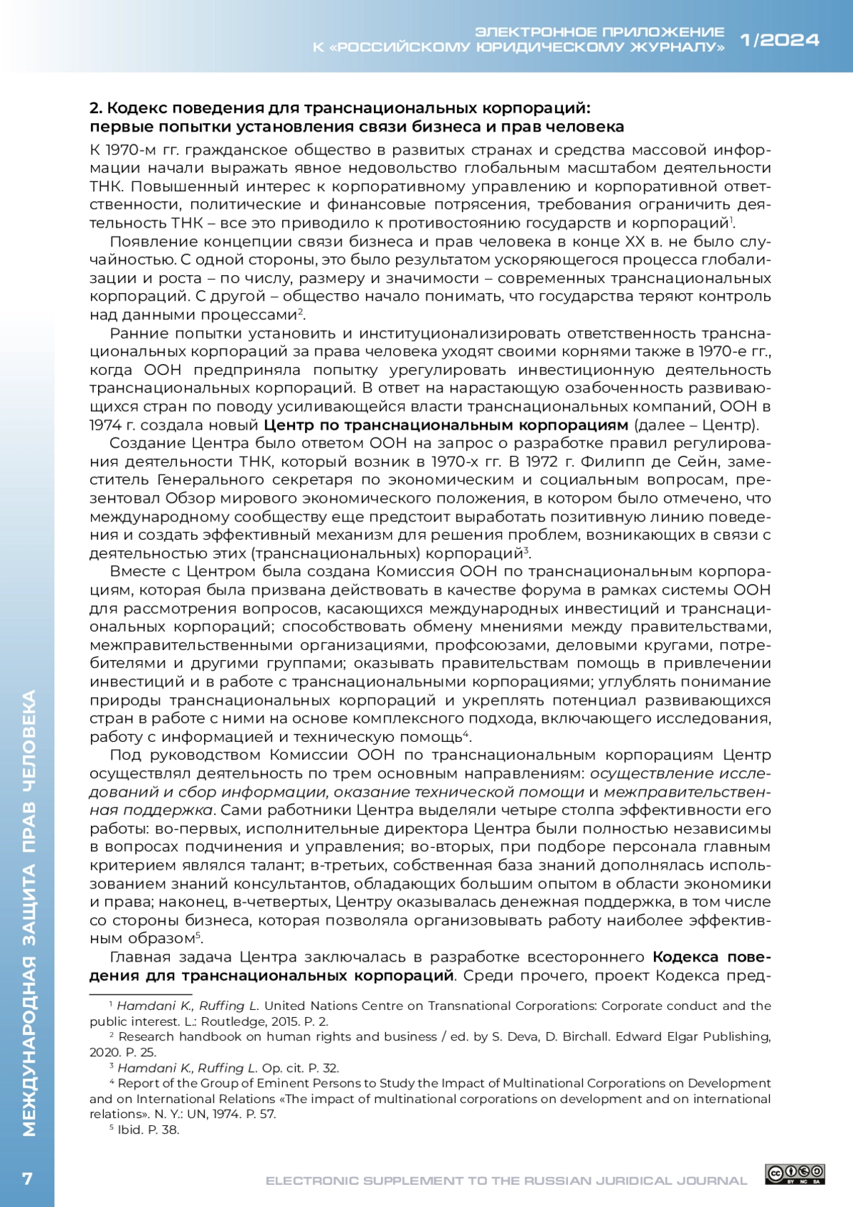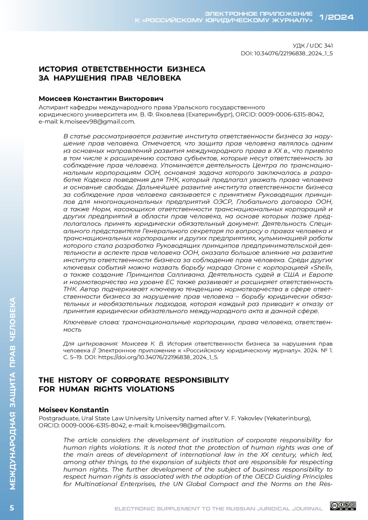 В статье рассматривается развитие института ответственности бизнеса за нарушение прав человека. Отмечается, что защита прав человека являлась одним из основных направлений развития международного права в XX в., что привело в том числе к расширению состава субъектов, которые несут ответственность за соблюдение прав человека. Упоминается деятельность Центра по транснациональным корпорациям ООН, основная задача которого заключалась в разработке Кодекса поведения для ТНК, который предлагал уважать права человека и основные свободы. Дальнейшее развитие института ответственности бизнеса за соблюдение прав человека связывается с принятием Руководящих принципов для многонациональных предприятий ОЭСР, Глобального договора ООН, а также Норм, касающихся ответственности транснациональных корпораций и других предприятий в области прав человека, на основе которых позже предполагалось принять юридически обязательный документ. Деятельность Специального представителя Генерального секретаря по вопросу о правах человека и транснациональных корпорациях и других предприятиях, кульминацией работы которого стала разработка Руководящих принципов предпринимательской деятельности в аспекте прав человека ООН, оказала большое влияние на развитие института ответственности бизнеса за соблюдение прав человека. Среди других ключевых событий можно назвать борьбу народа Огони с корпорацией «Shell», а также создание Принципов Салливана. Деятельность судей в США и Европе и нормотворчество на уровне ЕС также развивает и расширяет ответственность ТНК. Автор подчеркивает ключевую тенденцию нормотворчества в сфере ответственности бизнеса за нарушение прав человека - борьбу юридически обязательных и необязательных подходов, которая каждый раз приводит к отказу от принятия юридически обязательного международного акта в данной сфере.