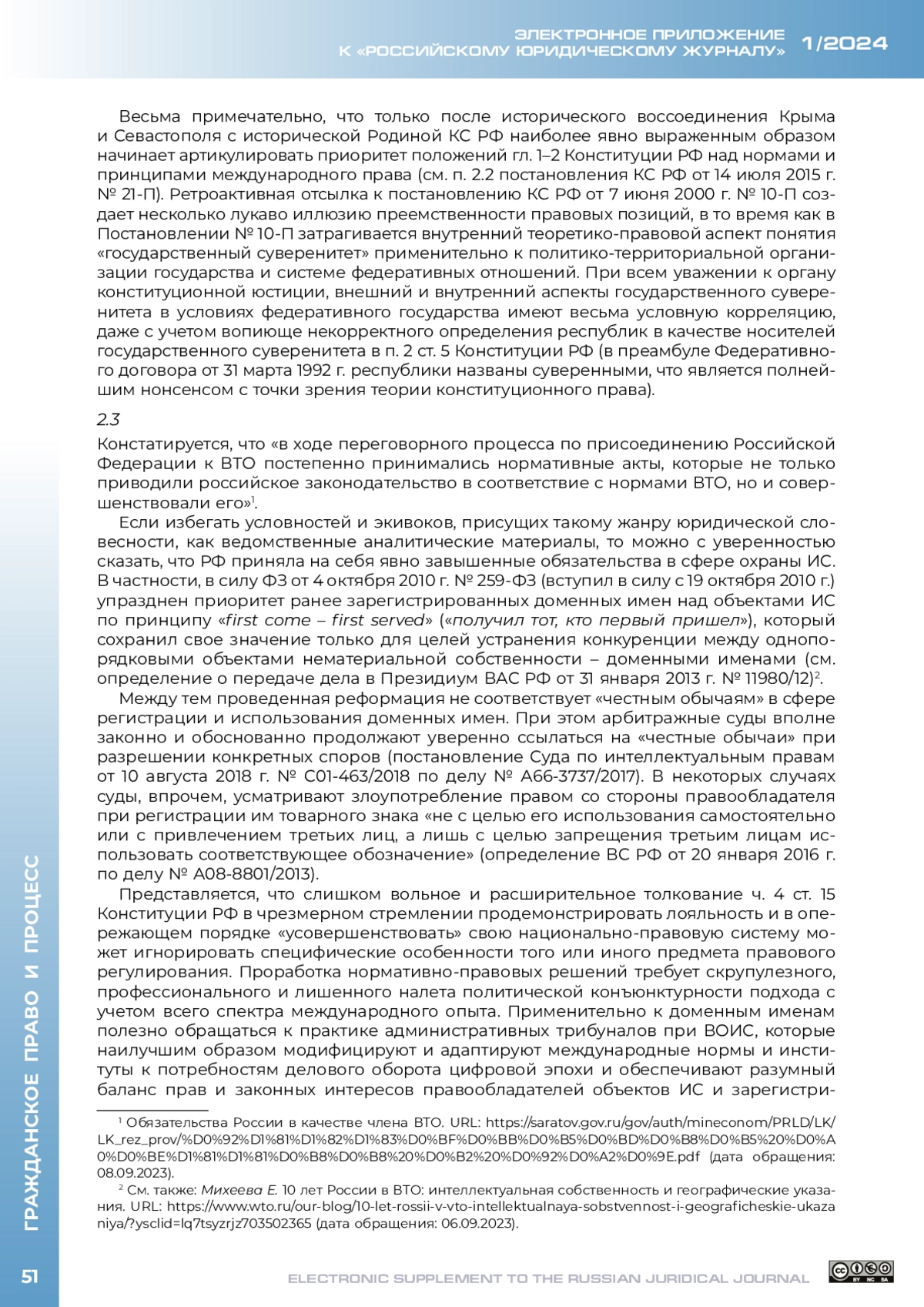 3. Михеева Е. 10 лет России в ВТО: интеллектуальная собственность и географические указания. URL: https://www.wto.ru/our-blog/10-let-rossii-v-vto-intellektualnaya-sobstvennost-i-geografi-cheskie-ukazaniya/?ysclid=lq7tsyzrjz703502365 (дата обращения: 06.09.2023).