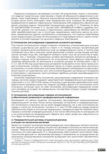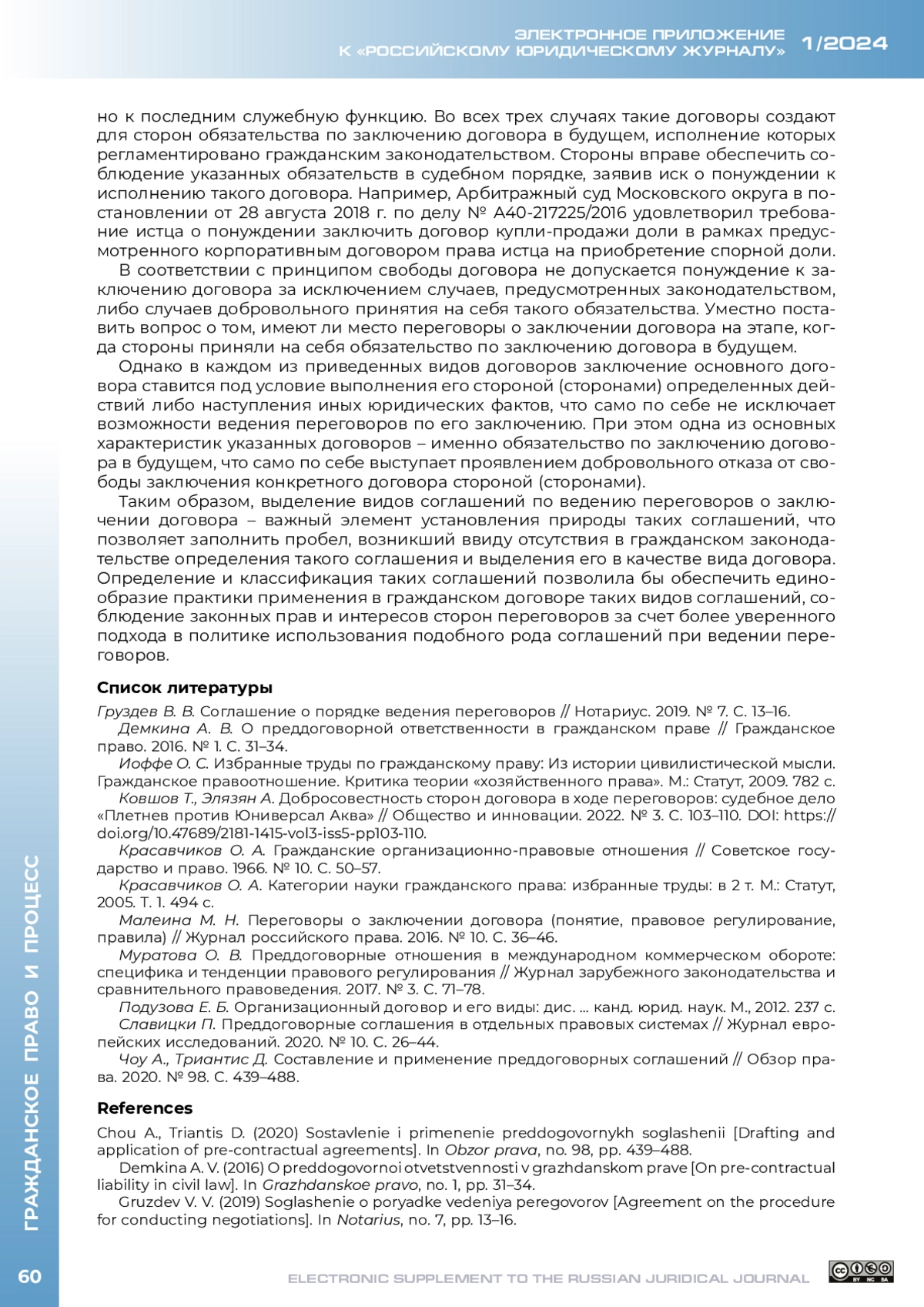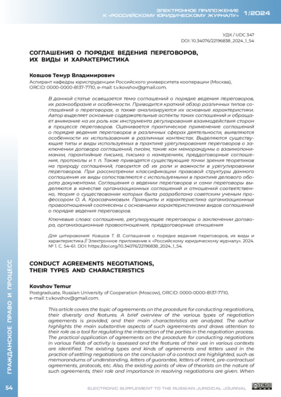 В данной статье освещается тема соглашений о порядке ведения переговоров, их разнообразие и особенности. Приводится краткий обзор различных типов соглашений о переговорах, а также анализируются их основные характеристики. Автор выделяет основные содержательные аспекты таких соглашений и обращает внимание на их роль как инструмента регулирования взаимодействия сторон в процессе переговоров. Оценивается практическое применение соглашений о порядке ведения переговоров в различных сферах деятельности, выявляются особенности их использования в различных контекстах. Выделяются существующие типы и виды используемых в практике урегулирования переговоров о заключении договора соглашений, писем, такие как меморандумы о взаимопонимании, гарантийные письма, письма о намерениях, преддоговорные соглашения, протоколы и т. п. Также приводятся существующие точки зрения теоретиков на природу соглашений, говорится об их роли и важности в урегулировании переговоров. При рассмотрении классификации правовой структуры данного соглашения их виды сопоставляются с используемыми в практике делового оборота документами. Соглашения о ведении переговоров и сами переговоры выделяются в качестве организационных соглашений и отношений соответственно, теория о существовании которых была разработана советским ученым профессором О. А. Красавчиковым. Принципы и характеристика организационных правоотношений соотнесены с основными характеристиками видов соглашений о порядке ведения переговоров.