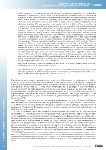 Наблюдение на выборах - неотъемлемая часть любой избирательной кампании, олицетворяющая принцип гласности и открытости организации и проведения выборов, - выступает одним из актуальных вопросов избирательного права. В избирательном законодательстве РФ закреплен достаточно широкий круг субъектов, наделенных функцией наблюдения, а по сути, контроля за осуществлением различных избирательных действий. Однако их статус различается по объему полномочий, срокам наблюдения. Цель статьи - на основе анализа избирательного законодательства и электоральной практики рассмотреть состав и полномочия субъектов, имеющих право осуществлять наблюдение на выборах, и внести предложения по совершенствованию избирательного законодательства РФ в данной сфере. Методологическую основу составили общенаучный диалектический метод познания социально-правовых явлений и вытекающие из него частнонаучные методы: формально-юридического анализа, наблюдения, историко-правовой, эмпирический, аналитический методы, позволившие использовать системный подход к изучению обозначенной проблемы. Рассмотрен состав субъектов, осуществляющих наблюдение на выборах по избирательному законодательству РФ. Выделено три категории субъектов наблюдения: 1) от государства; 2) от кандидатов, избирательных объединений (политических партий); 3) от общественности, в том числе международной (иностранной). Проведенное исследование позволило охарактеризовать субъектный состав уполномоченных осуществлять наблюдение на выборах, выявить пробелы и противоречия избирательного законодательства РФ в регулировании правового статуса данных лиц и внести предложения, способствующие совершенствованию норм избирательного законодательства. Анализ зарубежной практики позволил увидеть достоинства российского избирательного законодательства по изучаемому вопросу и в то же время показал возможные перспективные варианты расширения субъектного состава наблюдения, в том числе со стороны общественности.