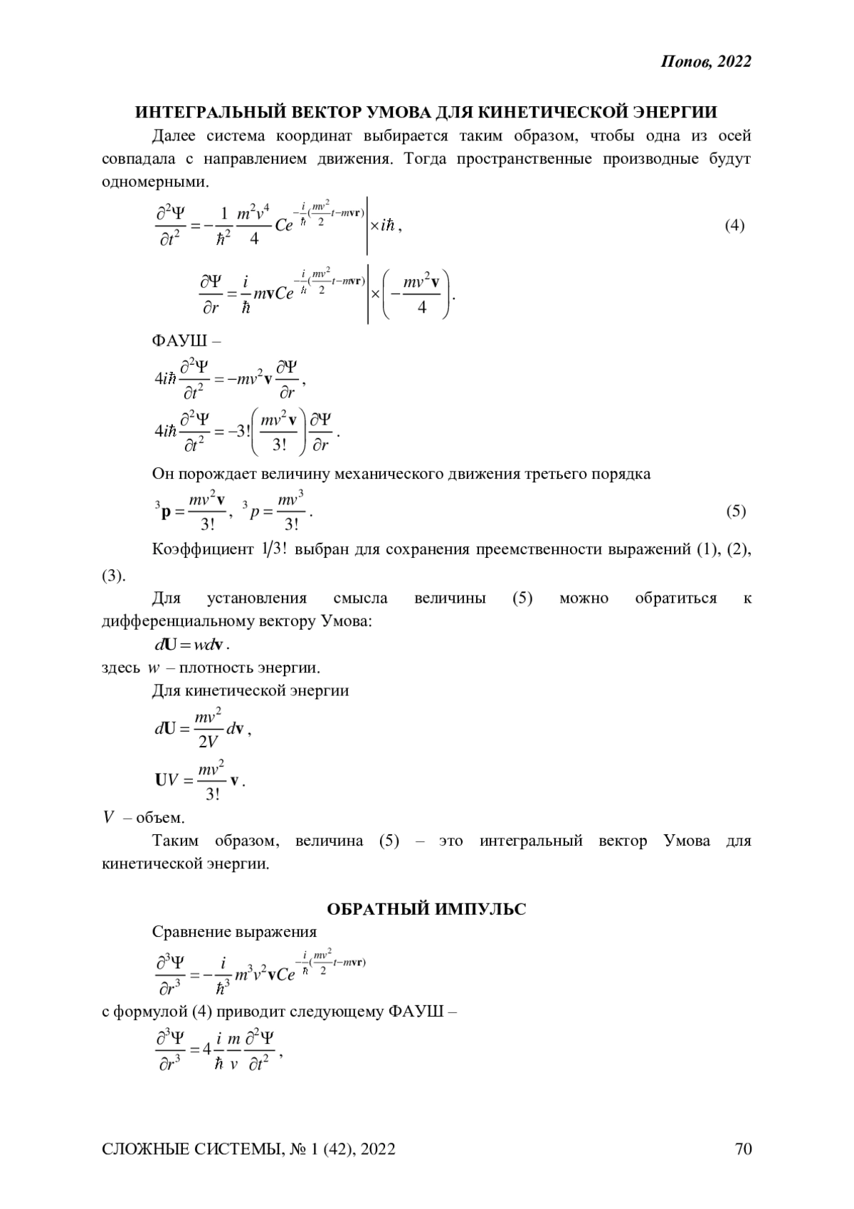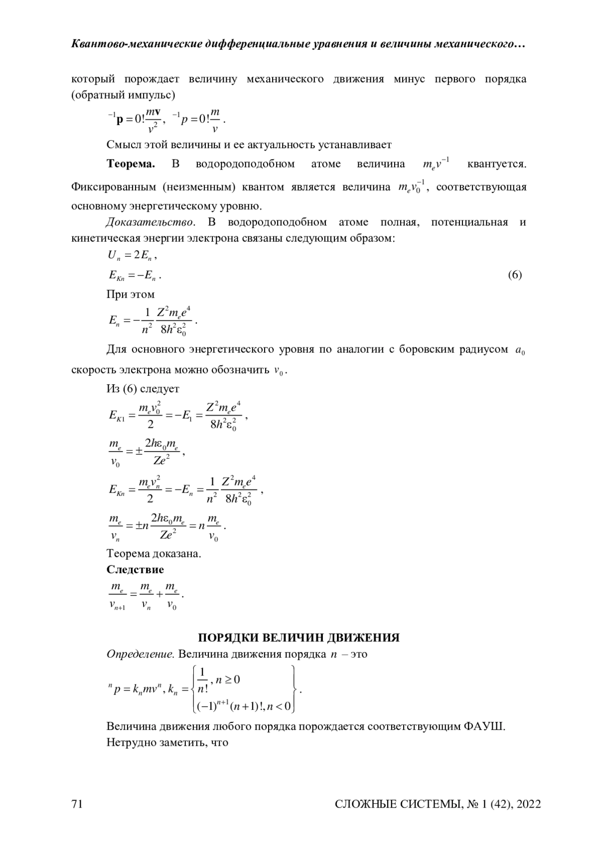Существующие и широко используемые величины механического движения, а именно: импульс или количество движения p = mv, а также кинетическая энергия p = mv 2/2 включают в себя одни и те же параметры - массу m и скорость v. Отличие между импульсом и кинетической энергией состоит в степени скорости и числовом коэффициенте. Формальные вариации степеней скорости и числовых коэффициентов приводят к появлению других величин механического движения. В тривиальном случае, когда степень скорости равна нулю, а числовой коэффициент - единице, имеет место величина 0 p = mv 0. Нетрудно заметить, что эта величина входит в уравнение Шредингера для свободной частицы. Это является предпосылкой для поиска других величин механического движения, входящих в состав квантово-механических уравнений, связанных с уравнением Шредингера.