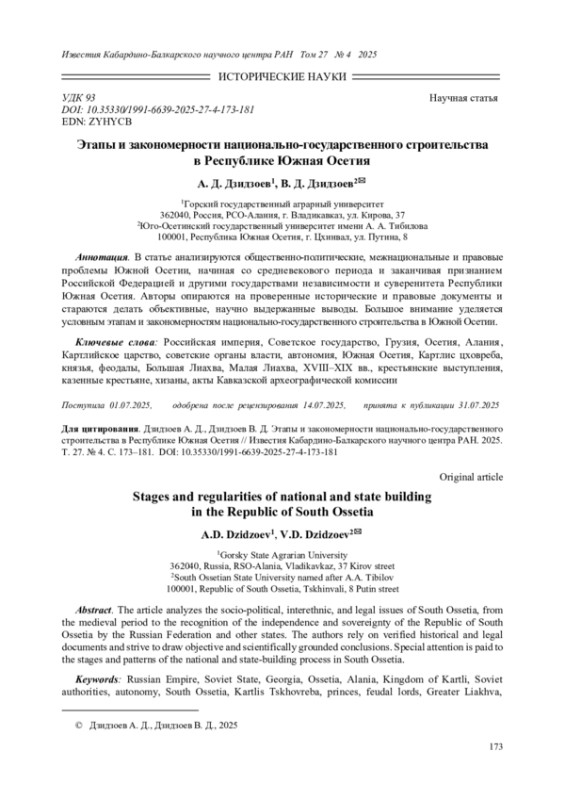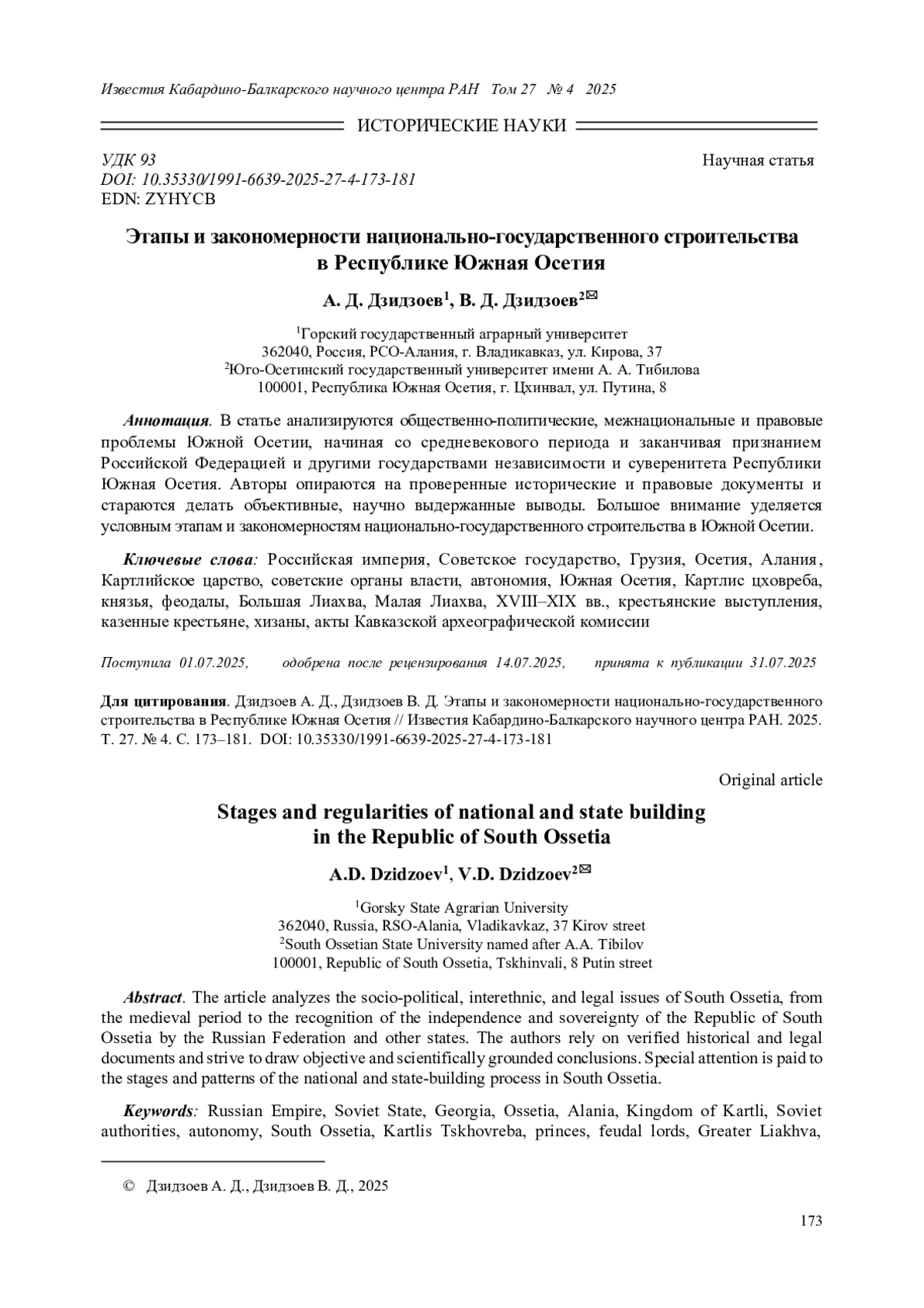 12. Дзидзоев В. Д. Подданство южных осетин феодальной Грузии (постановка вопроса) // XI Международный форум историков-кавказоведов, посвященный столетию принятия Конституции СССР 1924 г.; Народы Кавказа в ХVIII-ХХI вв.: история, политика, культура. Ростов-на-Дону, 2024. EDN: NGLHET