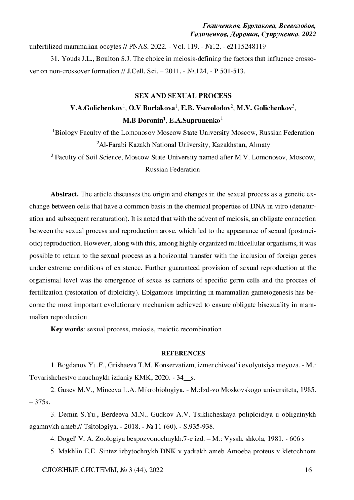 В статье рассматривается зарождение и изменения полового процесса как генетического обмена между клетками, имеющими общую основу в химических свойствах ДНК in vitro (денатурация и последующая ренатурация). Прослеживается упорядочивание полового процесса через создание универсальных механизмов размножения через митоз и мейоз при возникновении эукариот. Отмечается, что с появлением мейоза возникла облигатная связь между половым процессом и размножением, что привело к появлению полового (постмейотического) размножения. Однако, наряду с этим среди высокоорганизованных многоклеточных организмов оказался возможным возврат к половому процессу как горизонтальному переносу с включением чужеродных генов при экстремальных условиях существования. Дальнейшим гарантированным обеспечением полового размножения на организменном уровне явилось возникновение полов как носителей специфических половых клеток и процесса оплодотворения (восстановления диплоидности). Эпигамный импринтинг при гаметогенезе млекопитающих стал важнейшим эволюционной достигнутым механизмом, обеспечивающим облигатную двуполость при размножении у млекопитающих.
