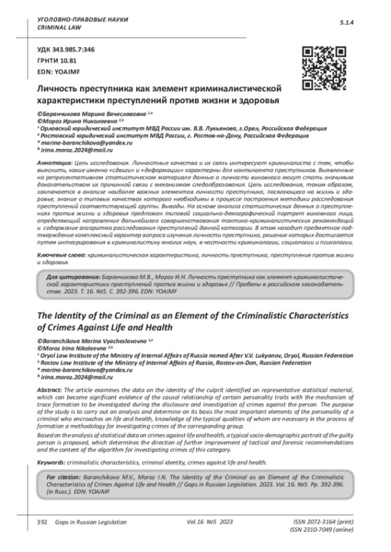 Цель исследования. Личностные качества и их связь интересуют криминалиста с тем, чтобы выяснить, какие именно «сдвиги» и «деформации» характерны для контингента преступников. Выявленные на репрезентативном статистическом материале данные о личности виновного могут стать значимым доказательством их причинной связи с механизмом следообразования. Цель исследования, таким образом, заключается в анализе наиболее важных элементов личности преступника, посягающего на жизнь и здоровье, знание о типовых качествах которого необходимы в процессе построения методики расследования преступлений соответствующей группы. Выводы. На основе анализа статистических данных о преступлениях против жизни и здоровья предложен типовой социально-демографический портрет виновного лица, определяющий направление дальнейшего совершенствования тактико-криминалистических рекомендаций и содержание алгоритма расследования преступлений данной категории. В этом находит предметное подтверждение комплексный характер вопроса изучения личности преступника, решение которых достигается путем интегрирования в криминалистику многих наук, в частности криминологии, социологии и психологии.