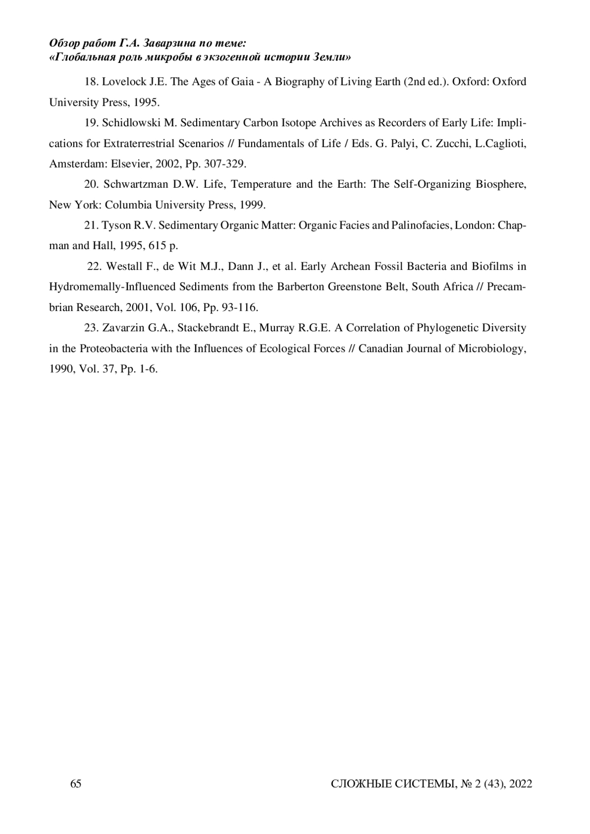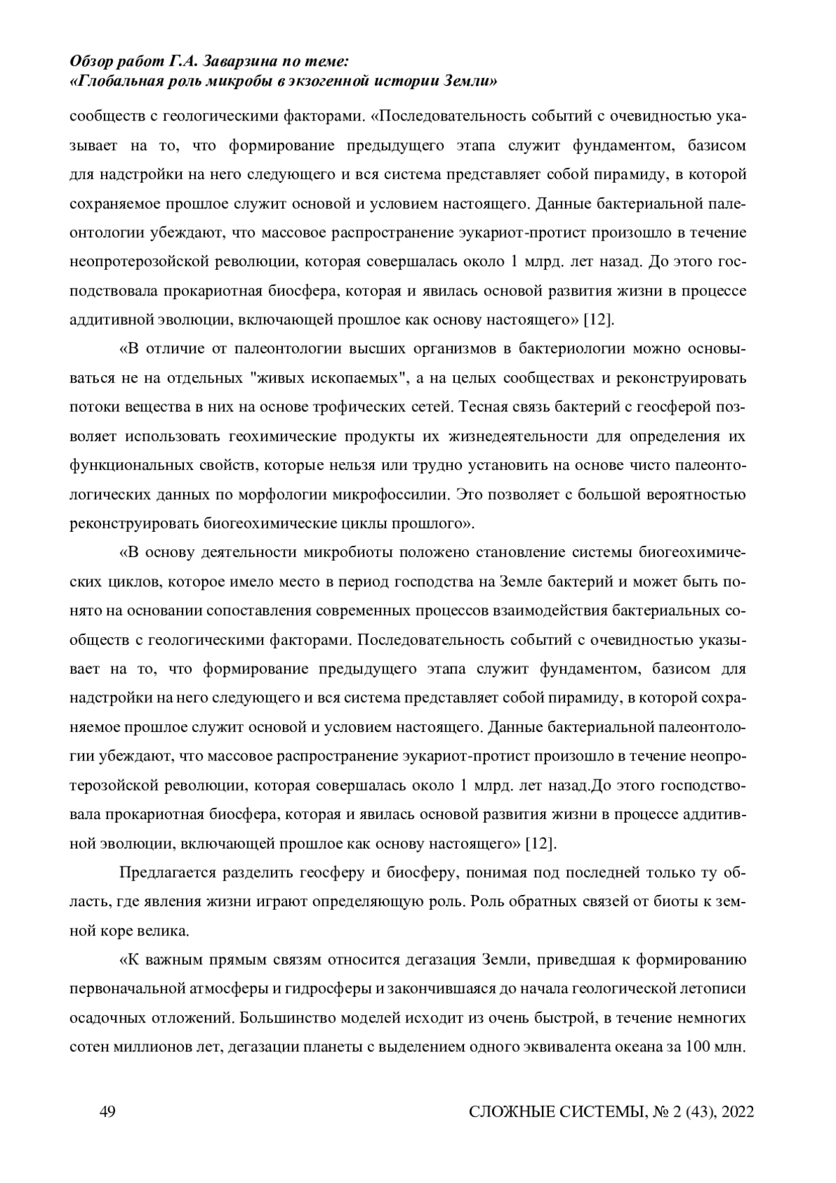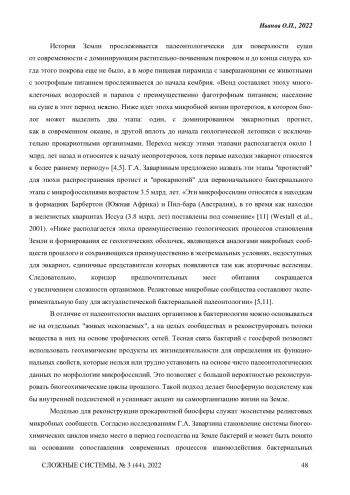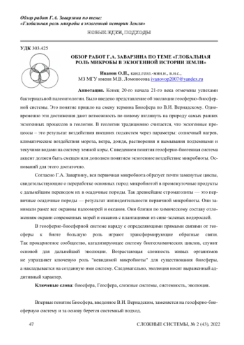 The end of the 20th and the beginning of the 21st century are marked by the successes of bacterial paleontology. The concept of the evolution of the geosphere-biosphere system was introduced. This concept replaced the term Biosphere according to V. I. Vernadsky. At the same time, these achievements provide an opportunity to take a fresh look at the nature of the earliest exogenous processes in geology. In geology, it is traditionally believed that exogenous processes are the result of the influence of external subsystems through parameters: solar heating, climatic effects of frost, wind, rain, dissolution and leaching by groundwater and flowing waters on the Earth’s crust system. With the introduction of the concept of geospheric-biogenic system, the emphasis should be shifted or supplemented with the concept of exogenous microbiota impact. There are enough reasons for this. According to G. A. Zavarzin, the entire primary microbiota forms almost closed cycles, indicating the processing of basic rocks by the microbiota into intermediate products with their further transfer to sedimentary rocks. Thus, the oldest stromatolites are primary sedimentary rocks - the result of the vital activity of the primary microbiota. They previously occupied all the outskirts of the paleomores and oceans. They are similar in chemical composition to the sediments of the margins of modern seas and oceans with plantations of blue-green algae. In the geosphere-biosphere system, along with the defining direct links from the geosphere to biota, transformative feedbacks play an important role. Thus, the prokaryotic community, which catalyzes the system of biogeochemical cycles, serves as the basis for further evolution. The increasing complexity of living organisms does not eliminate the key role of the “invisible microbiota” for the existence of the biosphere, but is superimposed on the system they have created. Consequently, evolution has a pronounced additive character.
