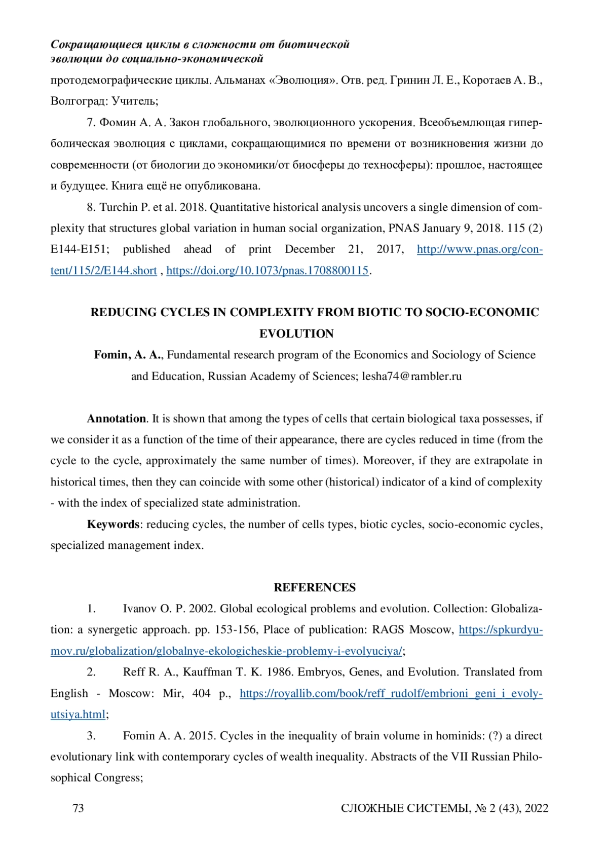 3. Фомин А. А. 2015. Циклы в неравенстве объёма мозга гоминид: (?) прямая эволюционная связь с современными циклами имущественного неравенства. Тезисы докладов VII Российского философского конгресса.