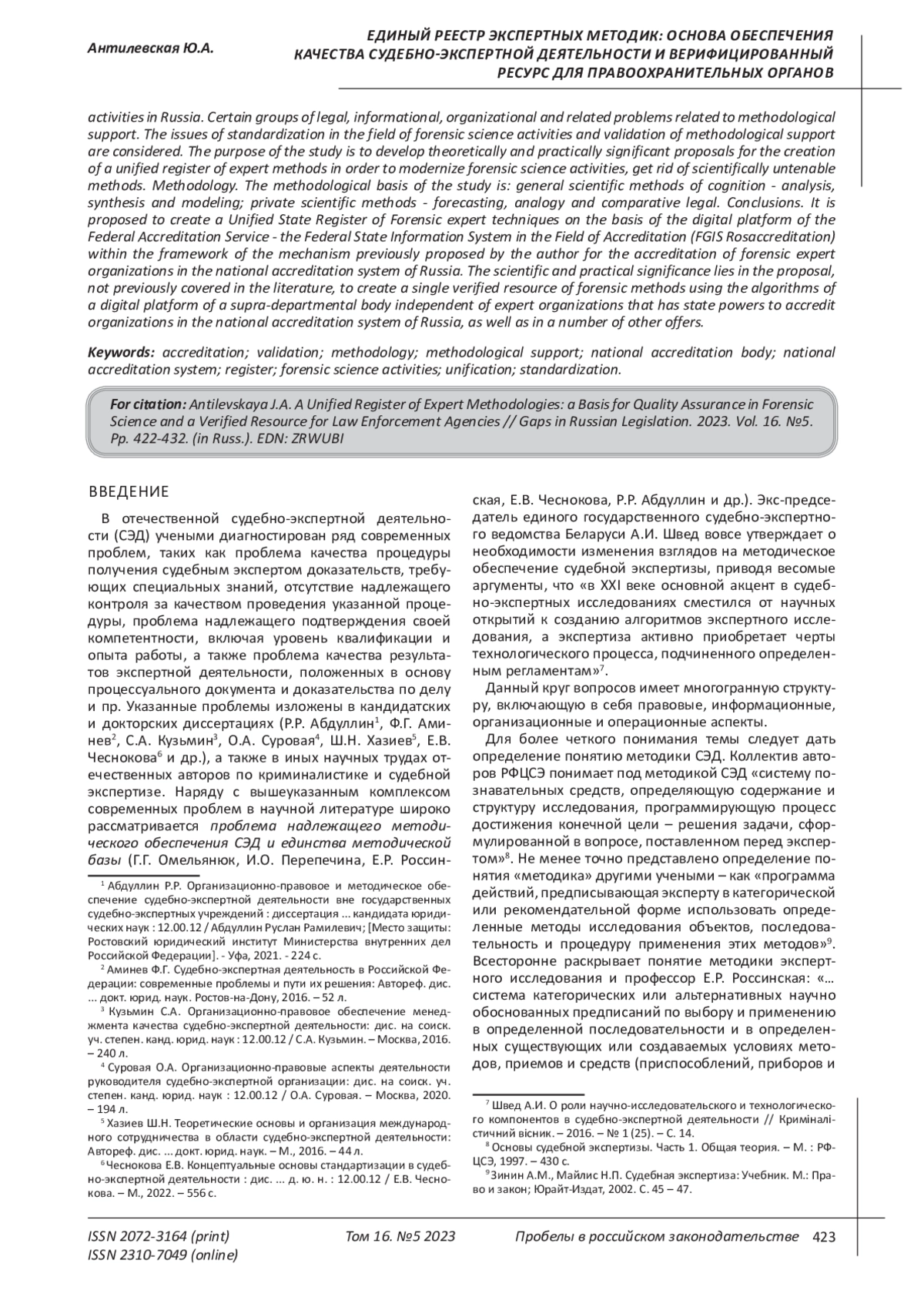 АНТИЛЕВСКАЯ Ю. А. ЕДИНЫЙ РЕЕСТР ЭКСПЕРТНЫХ МЕТОДИК: ОСНОВА ОБЕСПЕЧЕНИЯ КАЧЕСТВА СУДЕБНО-ЭКСПЕРТНОЙ ДЕЯТЕЛЬНОСТИ И ВЕРИФИЦИРОВАННЫЙ РЕСУРС ДЛЯ ПРАВООХРАНИТЕЛЬНЫХ ОРГАНОВ // ПРОБЕЛЫ В РОССИЙСКОМ ЗАКОНОДАТЕЛЬСТВЕ. 2023. Т. 16 № 5