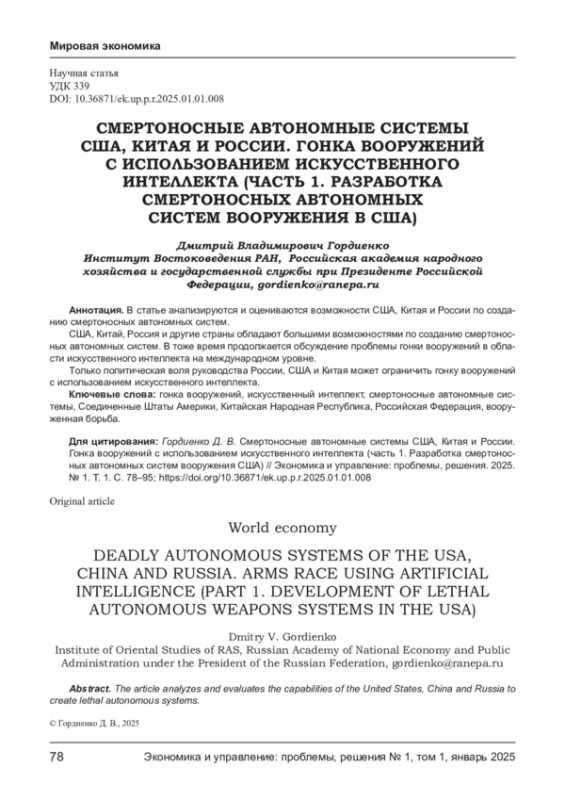 В статье анализируются и оцениваются возможности США, Китая и России по созданию смертоносных автономных систем. США, Китай, Россия и другие страны обладают большими возможностями по созданию смертоносных автономных систем. В тоже время продолжается обсуждение проблемы гонки вооружений в области искусственного интеллекта на международном уровне. Только политическая воля руководства России, США и Китая может ограничить гонку вооружений с использованием искусственного интеллекта.