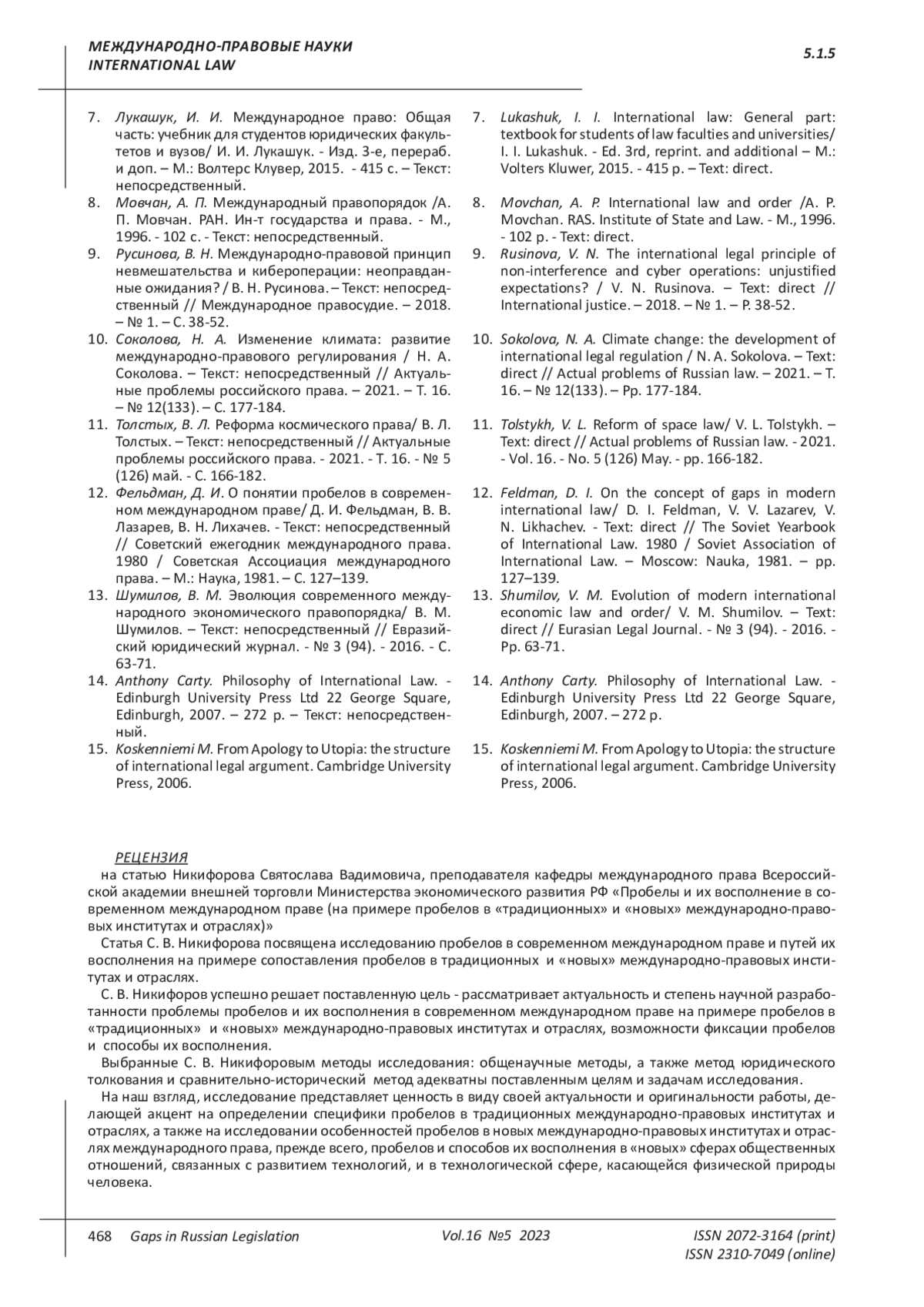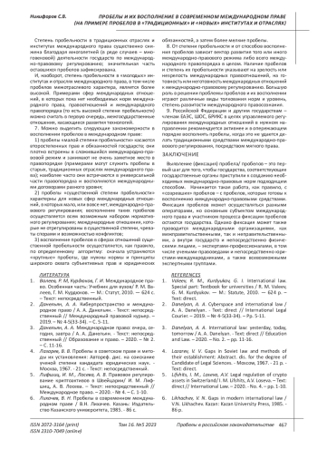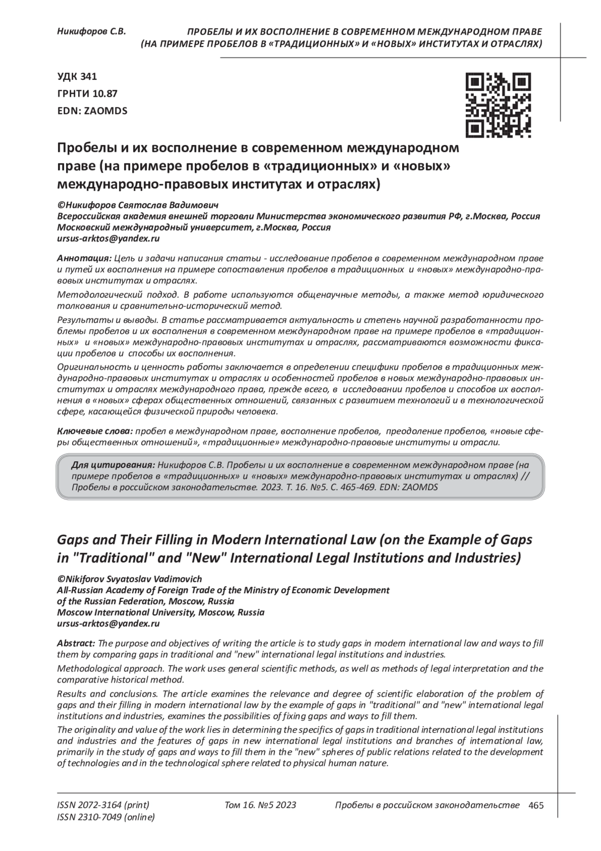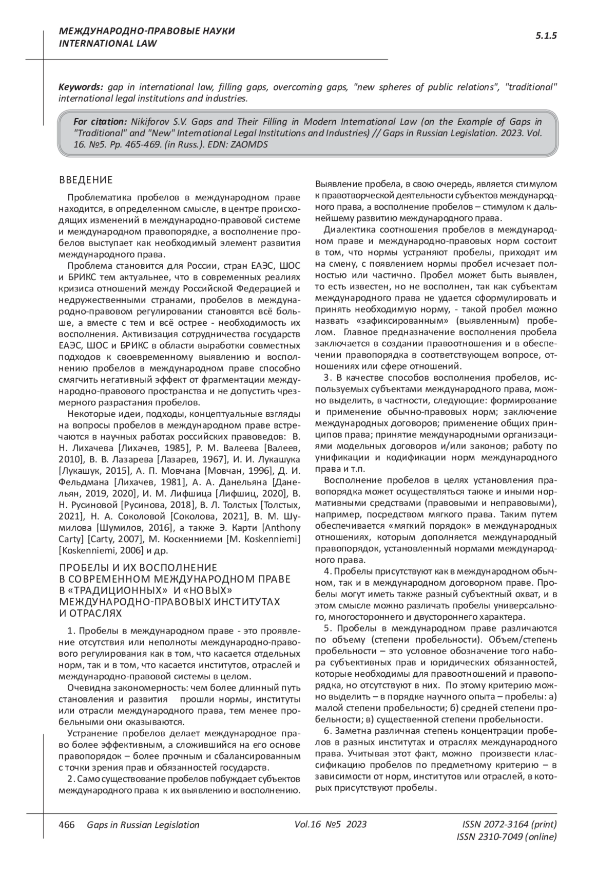 НИКИФОРОВ В. А. ПРОБЕЛЫ И ИХ ВОСПОЛНЕНИЕ В СОВРЕМЕННОМ МЕЖДУНАРОДНОМ ПРАВЕ (НА ПРИМЕРЕ ПРОБЕЛОВ В "ТРАДИЦИОННЫХ" И "НОВЫХ" МЕЖДУНАРОДНО-ПРАВОВЫХ ИНСТИТУТАХ И ОТРАСЛЯХ) // ПРОБЕЛЫ В РОССИЙСКОМ ЗАКОНОДАТЕЛЬСТВЕ. 2023. Т. 16 № 5