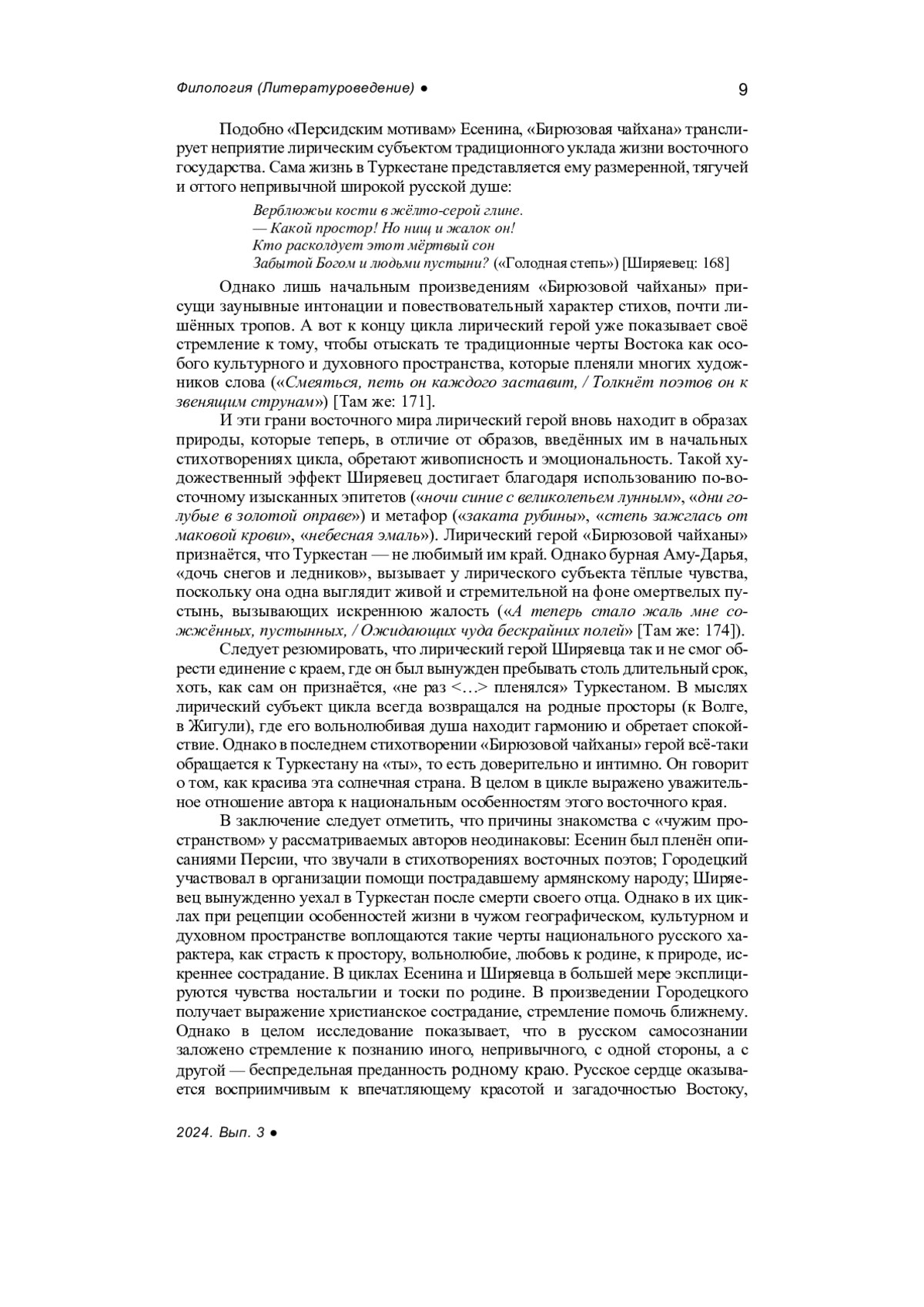 Настоящее исследование имеет своей целью проследить особенности воплощения «чужого пространства» в ориентальных циклах поэтов-новокрестьян С. А. Есенина и А. В. Ширяевца, а также в художественном единстве С. М. Городецкого. В работе предпринимается попытка отобразить национальные детерминанты в изображении неродных просторов в лирических единствах «Персидские мотивы», «Бирюзовая чайхана», «Ангел Армении», созданных названными авторами. В работе обращается особое внимание на стремление лирических героев исследуемых произведений погрузиться в атмосферу другого государства, понять и принять его традиции, особенности культуры и палитру нравов, принятых в ином, с точки зрения национального самосознания, обществе. В результате работы устанавливается, что особенности образного строя рассматриваемых произведений С. А. Есенина, А. В. Ширяевца, С. М. Городецкого свидетельствуют об общности восприятия ими «чужого пространства», основанного на толерантности по отношению к инокультурным реалиям, что оказывается одной из черт национального самосознания русского человека. Итоги исследования фиксируют наличие творческого диалога в художественном наследии поэтов Серебряного века