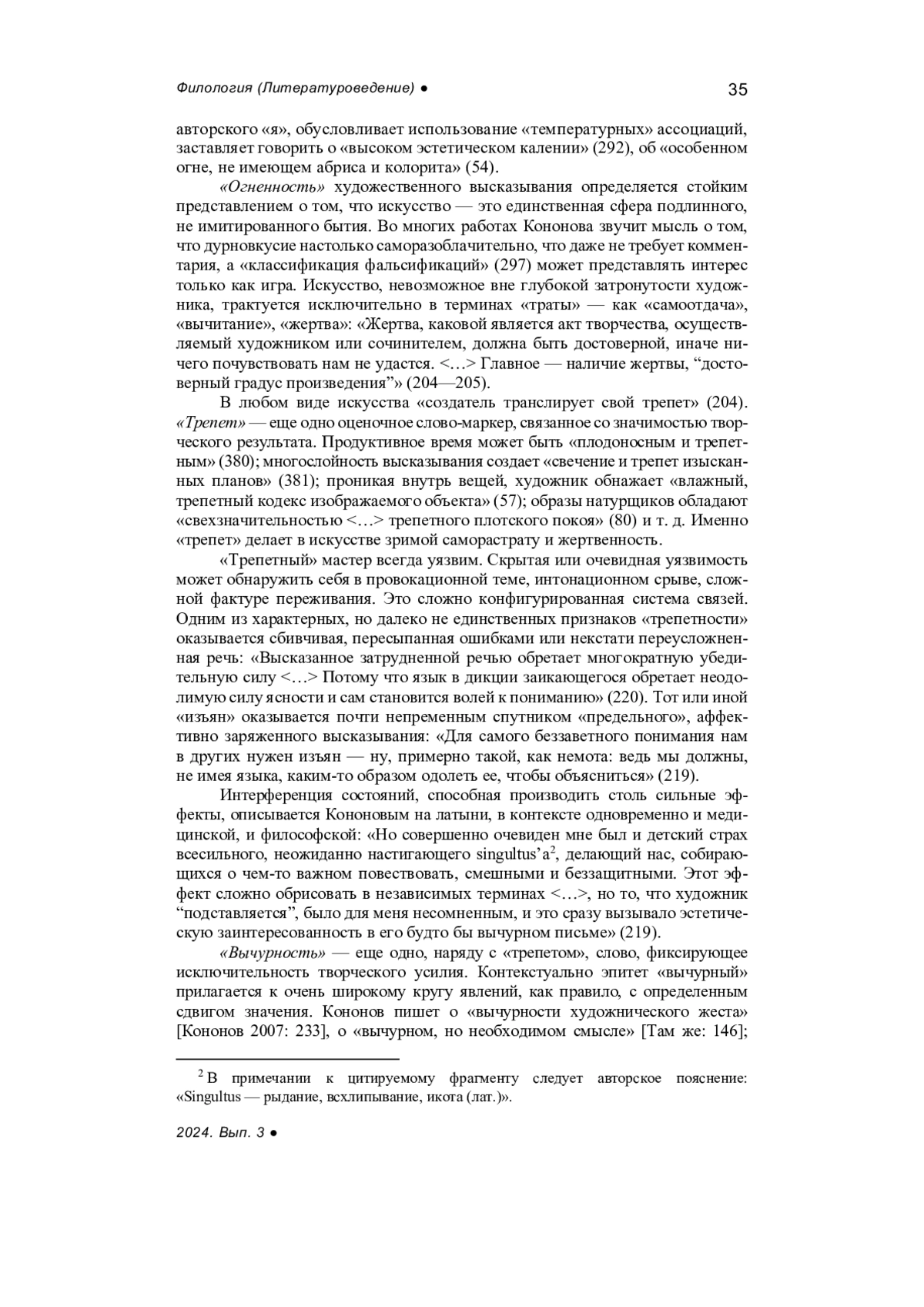В статье на материале эссе Н. Кононова об искусстве реконструируется его система представлений об эстетическом, выявляются ключевые эстетические концепты, описываются их связи. В понимании Н. Кононова, заслуживает внимания лишь то искусство, в котором художник «существует в своем жизненном пределе», а творческое усилие является «жертвой». Именно это позволяет сохранять за искусством значение единственной сферы подлинного, не имитированного бытия. Оно помогает сохранять меру вещей, называть вещи своими именами. «Вычурность» — характеристика предельной эстетической формы, «искренность» — характеристика предельного самораскрытия субъекта. Они нацелены на обретение аутентичности, совмещение пережитого и выраженного. Его условием оказывается стремление к постоянному превосхождению художником собственных возможностей. Стремление к ускользающей цели делает любое искусство «искусством аппроксимаций», определяет его наполненность «апориями» и противоречиями. Стремление к постижению предмета со всех возможных ракурсов заставляет задаваться вопросом о пределах доступного выражению. Любой художник одержим «ловитвой» за ускользающими смыслами. Однако в соответствии с логикой «апорий», успешность этой охоты может одновременно означать утрату объекта.