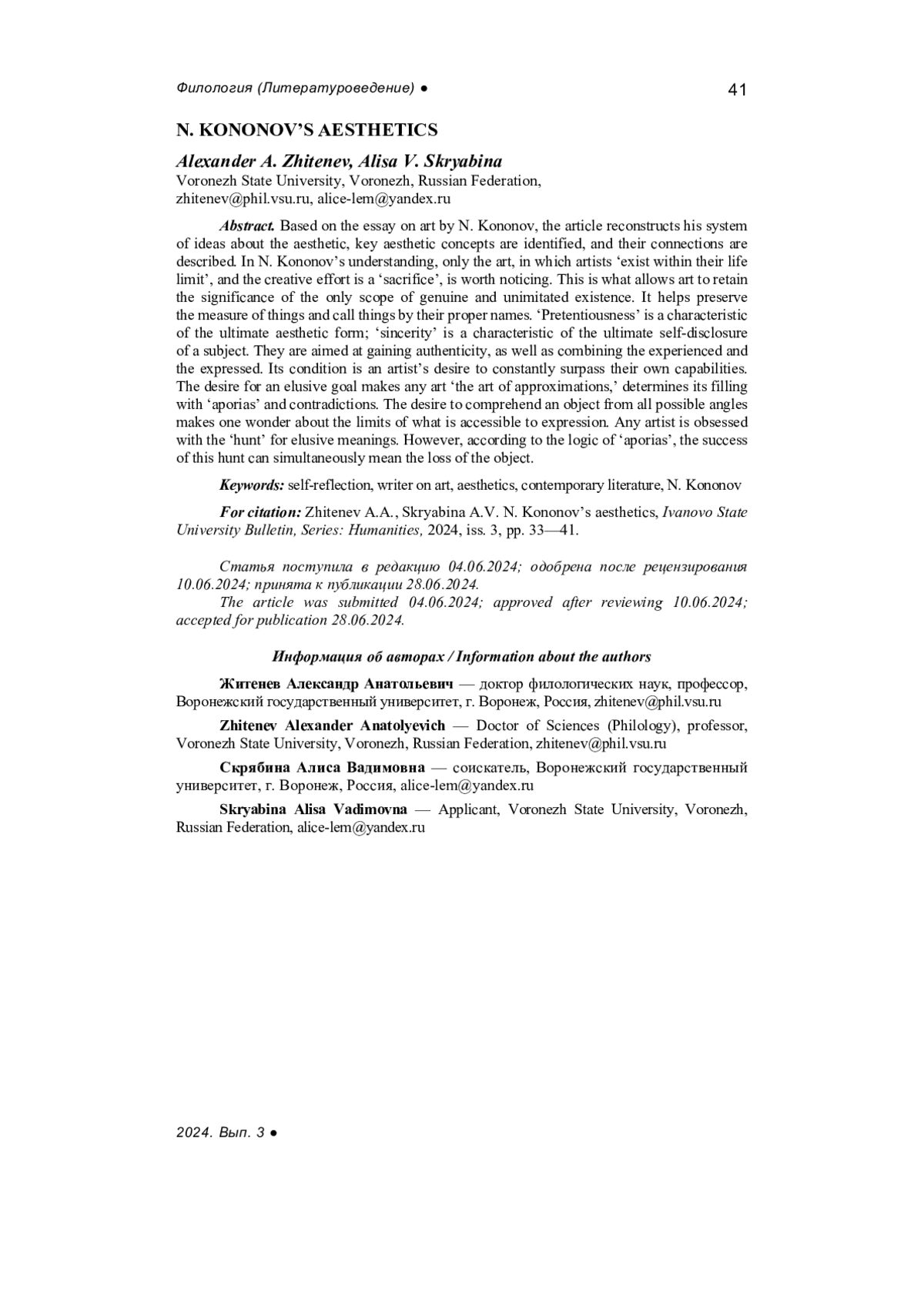 ЖИТЕНЕВ А. А., СКРЯБИНА А. В. ЭСТЕТИКА НИКОЛАЯ КОНОНОВА // ВЕСТНИК ИВАНОВСКОГО ГОСУДАРСТВЕННОГО УНИВЕРСИТЕТА. СЕРИЯ: ГУМАНИТАРНЫЕ НАУКИ. 2024. № 3